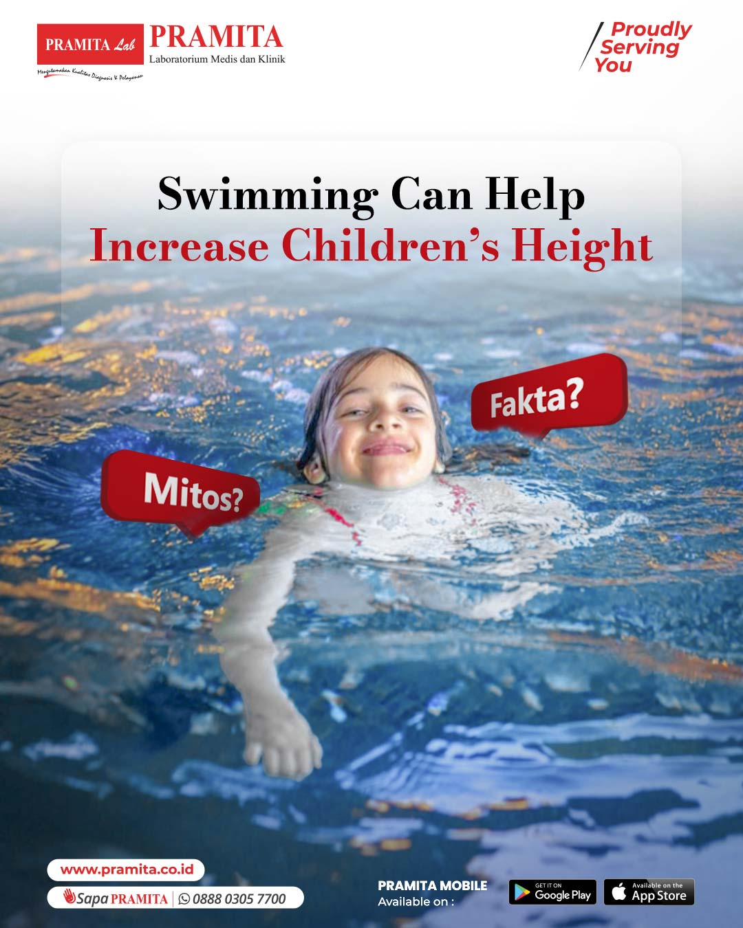 Myth or Fact: Can Swimming Make Children Taller? Many of PRAMITA’s friends may have heard that swimming can increase a child’s height. But is that really true? The answer is: partly true, partly a myth. Swimming indeed provides many benefits for growth, but it is not the only factor that determines a child’s height. Let’s explore this further and also look at the types of laboratory tests that can help monitor a child’s growth and development optimally. Fact: Swimming Supports Growth Se...