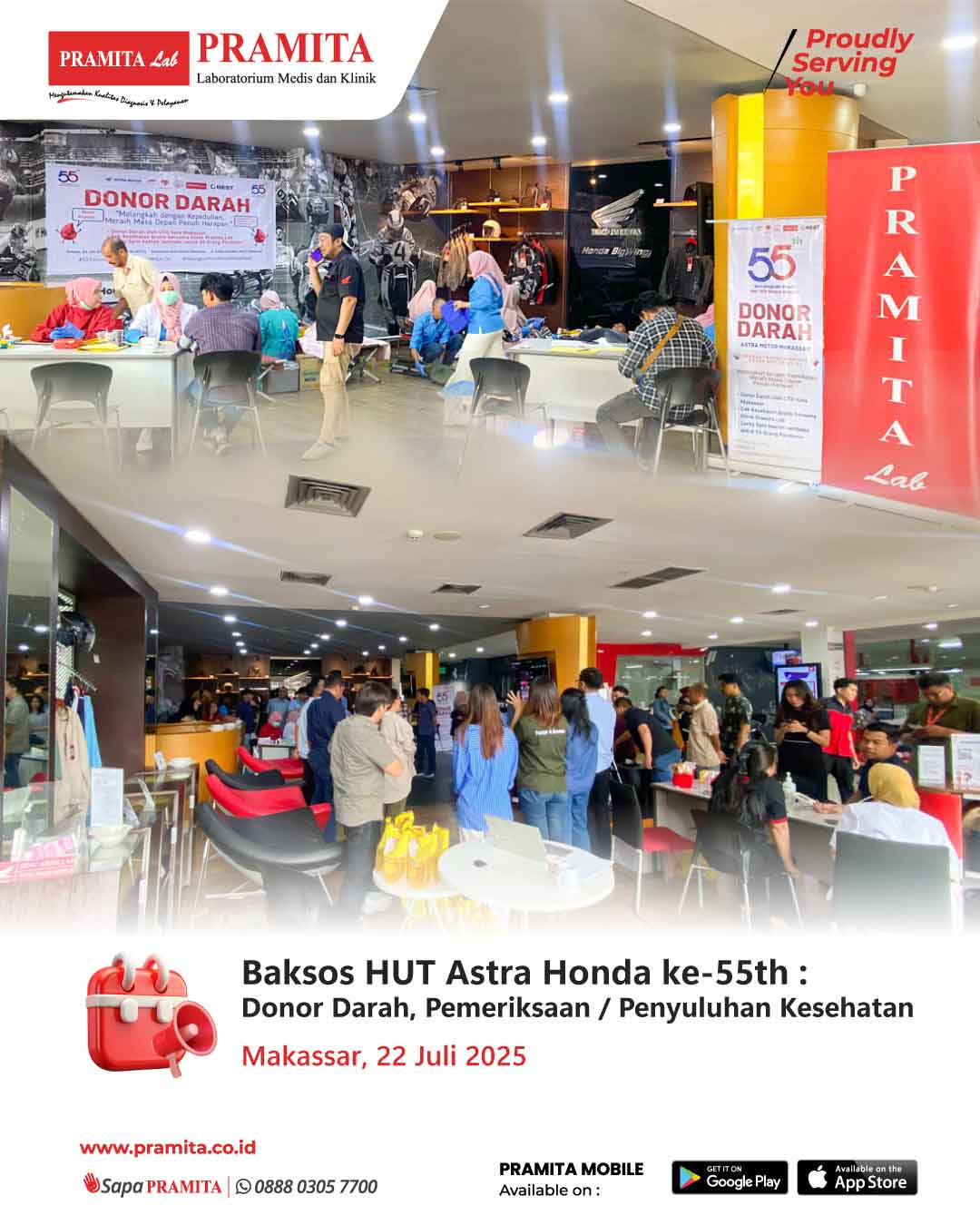 Fri, 1 Aug 2025Pada tanggal 22 Juli 2025, PRAMITA Cabang Makassar turut ambil bagian dalam kegiatan bakti sosial: “Donor Darah, Cek Kesehatan Gratis, dan Konsultasi Kesehatan” yang diadakan dalam rangkaian acara memperingati HUT ke-55 Th PT ASTRA Honda 2025.