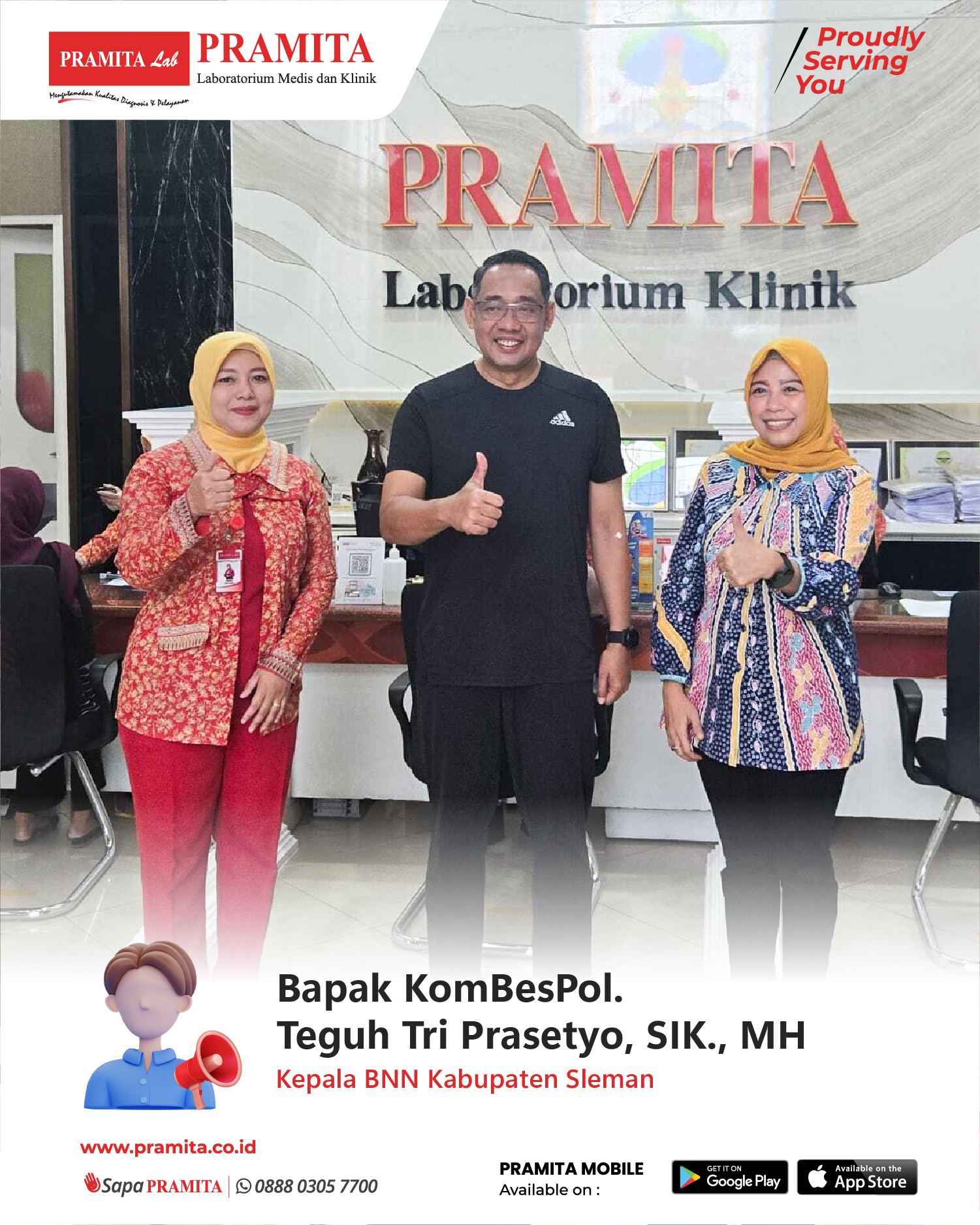 Thu, 31 Jul 2025Terimakasih kepada Bapak KomBesPol. Teguh Tri Prasetyo, SIK., MH (Kepala BNN) Kabupaten Sleman telah mempercayakan pemeriksaan kesehatan berkala di PRAMITA Cabang Cik Ditiro Yogyakarta.