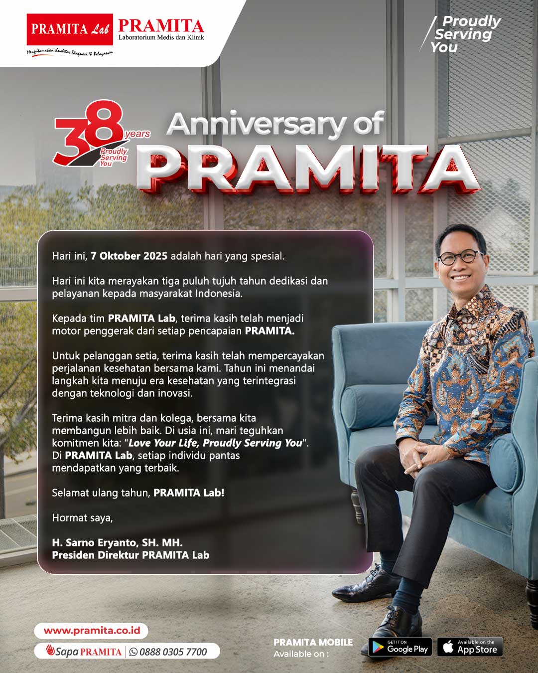 Tue, 7 Oct 2025Usia ke-38 tahun menjadi momentum penting bagi Laboratorium Klinis & Medis PRAMITA untuk terus meneguhkan komitmen dalam memberikan layanan kesehatan yang berkualitas, akurat, dan terpercaya. Perjalanan panjang ini menjadi bukti nyata dedikasi seluruh karyawan, kepercayaan pelanggan, serta dukungan mitra yang senantiasa tumbuh bersama PRAMITA. Di tengah perkembangan dunia medis yang dinamis, PRAMITA bertekad untuk terus berinovasi, menjaga profesionalisme, dan berkontribusi dalam peningkatan der...