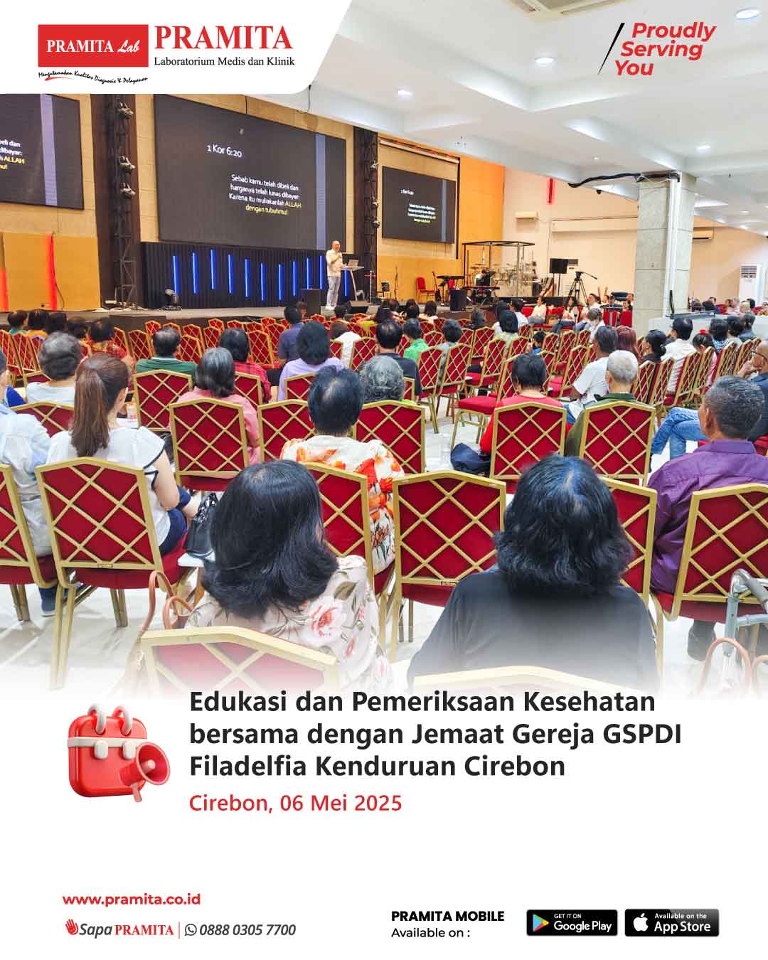 Sat, 10 May 2025PRAMITA Cabang Cirebon kembali menunjukkan komitmennya dalam mendukung program promotif dan preventif dengan berpartisipasi dalam kegiatan Ibadah Filadelfia Gold yang diselenggarakan oleh Gereja GSPDI Filadelfia Kenduruan Cirebon. Kegiatan ini dihadiri oleh kurang lebih 120 jemaat yang merupakan kelompok usia 50 tahun ke atas. Mengusung tema "Hidup Sehat adalah Penyembahan bagi Tuhan", dr. Rudy Irawan Hadinoto mengajak jemaat untuk memahami bahwa menjaga kesehatan tubuh bukan sekadar kebutuhan f...