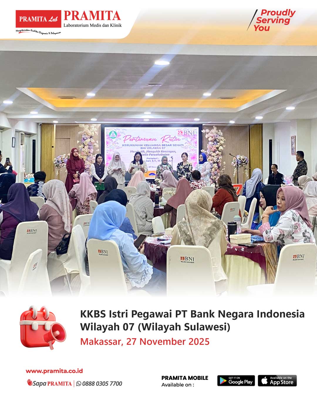 Sat, 6 Dec 2025Sebagai upaya peningkatan kesadaran kesehatan di kalangan komunitas profesional, PRAMITA Cabang Makassar berpartisipasi dalam kegiatan rutin Kerukunan Keluarga Besar Sehati (KKBS) — organisasi istri pegawai PT Bank Negara Indonesia (BNI) Wilayah 07 yang meliputi wilayah Sulawesi Selatan, Sulawesi Barat, Sulawesi Tenggara, dan Maluku. Acara ini diikuti oleh sekitar 50 peserta dari berbagai cabang BNI di wilayah tersebut. Dalam kegiatan ini, PRAMITA Makassar menyediakan layanan pemeriksaan kese...