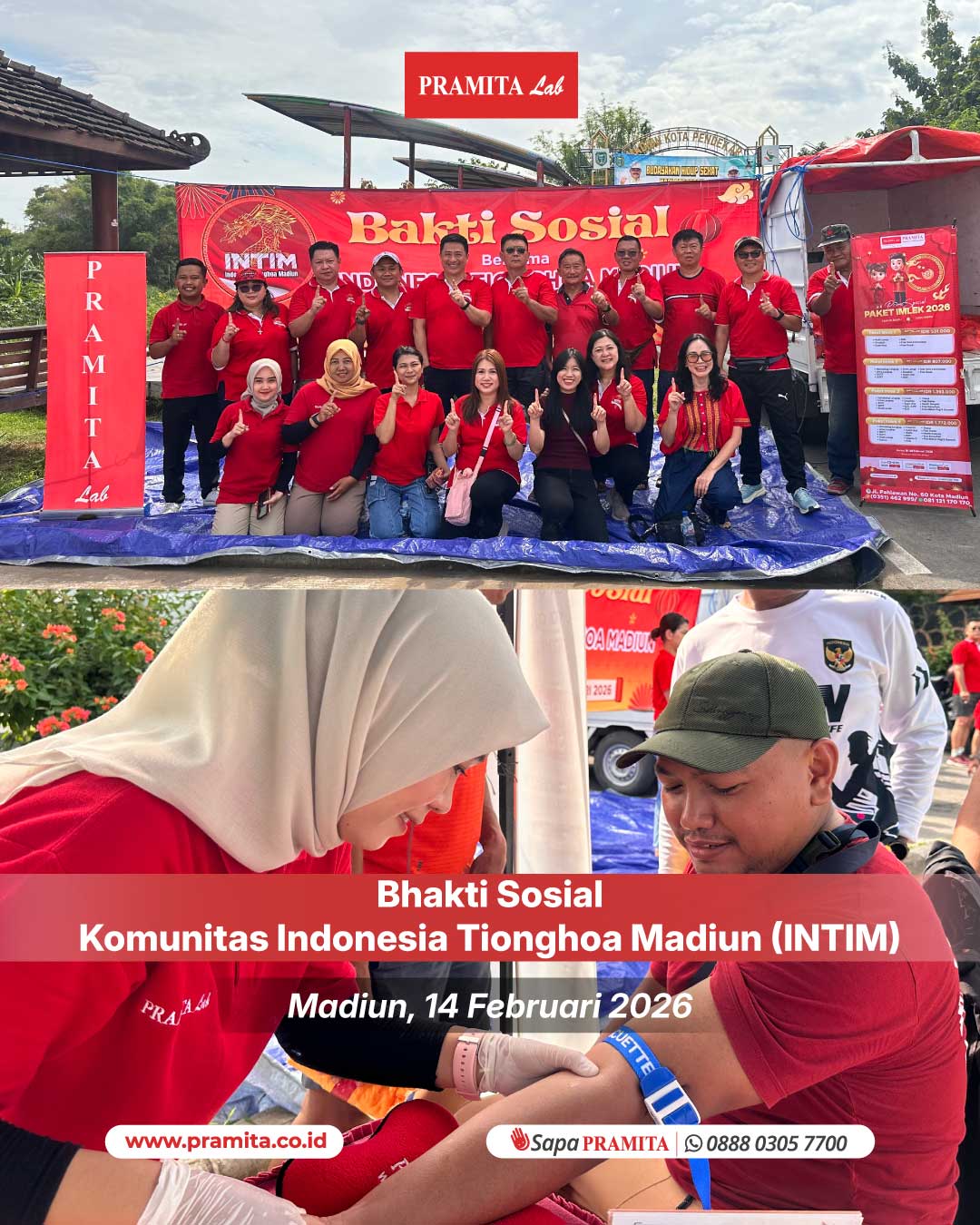 Sat, 21 Feb 2026Madiun, Sabtu, 14 Februari 2026 — PRAMITA Madiun bersinergi bersama Komunitas Indonesia Tionghoa Madiun (INTIM) mengadakan bhakti sosial kepada masyarakat Kota Madiun, bertempat di Taman Bantaran Kota Madiun. Kegiatan yang diikuti sekitar 150 peserta ini berlangsung hangat dan penuh semangat kebersamaan. Dalam kesempatan tersebut, PRAMITA menghadirkan layanan skrining hipertensi dan glukosa darah, sekaligus memberikan informasi layanan di PRAMITA Madiun, di antaranya: Home Service, laboratori...