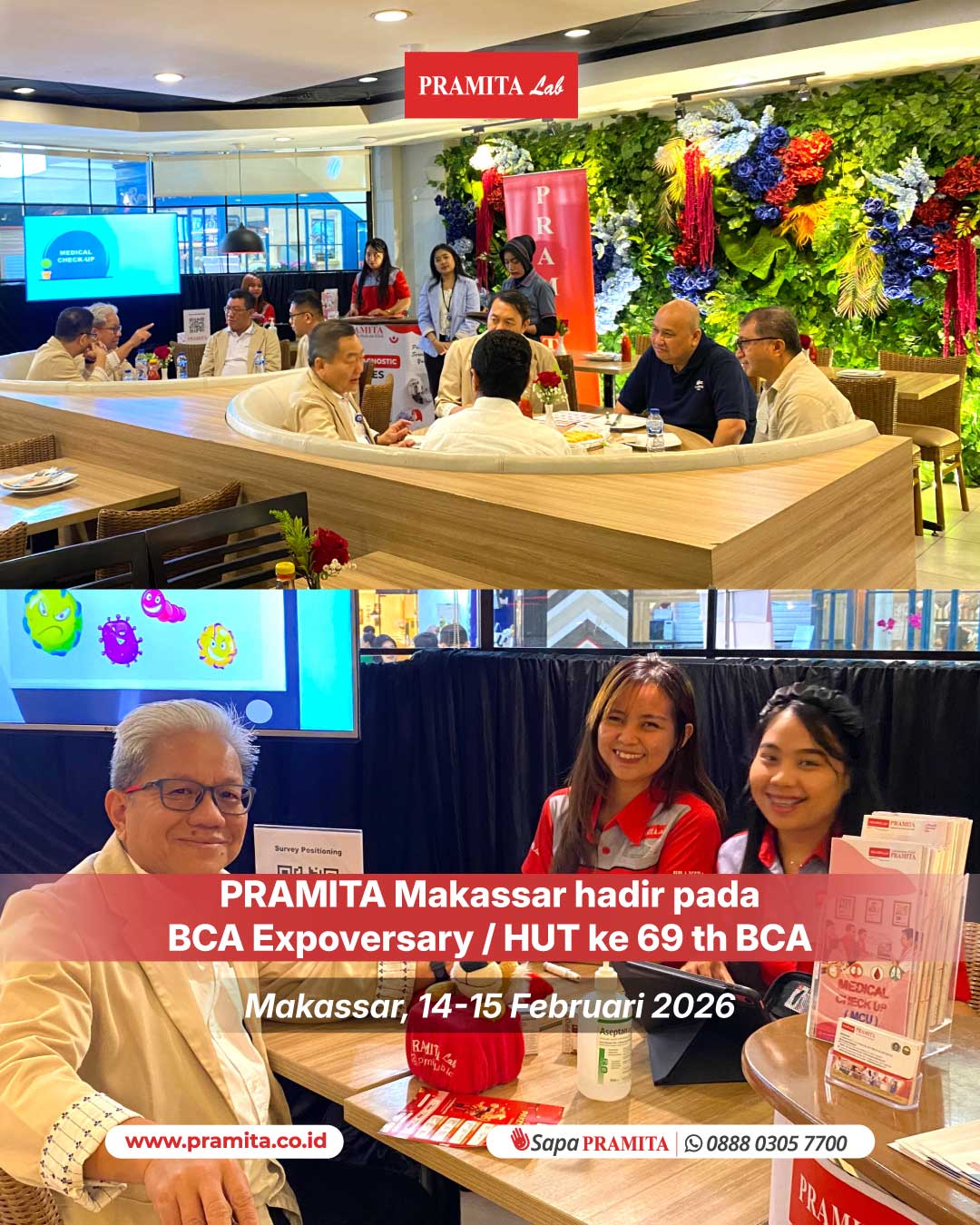 Sat, 21 Feb 2026Makassar, 14–15 Februari 2026 — PRAMITA Makassar turut ambil bagian dalam BCA Expoversary 2026 yang diselenggarakan PT Bank Central Asia Tbk dalam rangka peringatan HUT ke-69 BCA di Mal Ratu Indah (MaRI). Kegiatan yang dipadati pengunjung ini menjadi ajang kolaborasi layanan antara PRAMITA dan BCA dengan menghadirkan pemeriksaan skrining kesehatan bagi nasabah Prioritas dan Solitaire di area lounge. Melalui layanan tersebut, PRAMITA memberikan kemudahan akses pemantauan kondisi kesehatan seca...