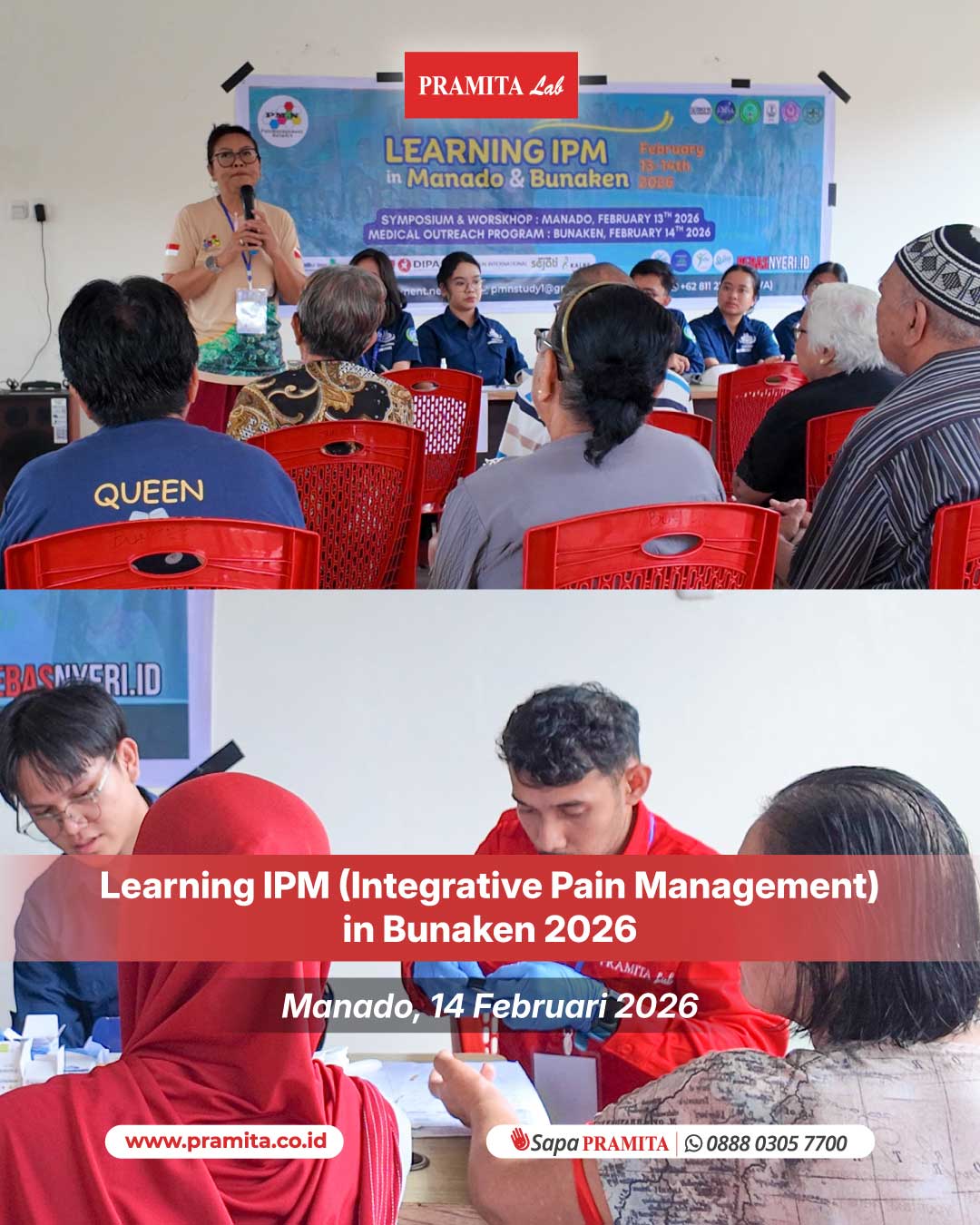 Sat, 21 Feb 2026Manado, 14 Februari 2026 — PRAMITA Cabang Manado turut berkontribusi dalam kegiatan Learning IPM (Integrative Pain Management) in Bunaken 2026 yang diselenggarakan oleh Komunitas Pain Management Network (PMN) di Puskesmas Bunaken, Sulawesi Utara. IPM diadakan dengan tujuan meningkatkan pengetahuan dan keterampilan dokter umum serta dokter spesialis multidisiplin dalam bidang manajemen nyeri, sekaligus dirangkaikan dengan bakti sosial pemeriksaan kesehatan bagi masyarakat. Sekitar 1.500 pesert...