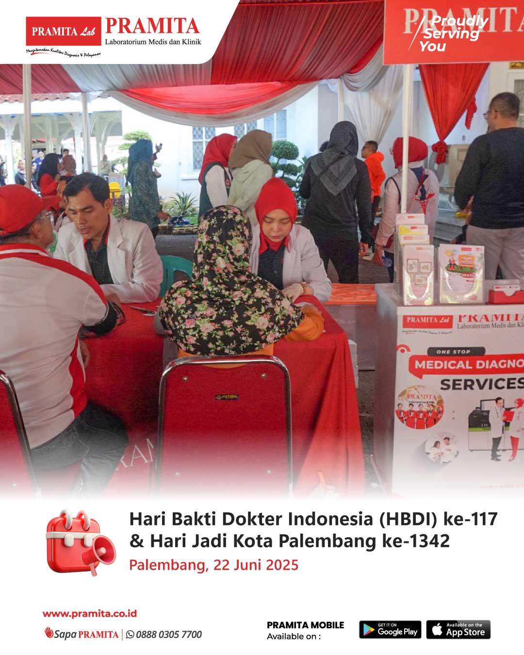 Sat, 5 Jul 2025Dalam rangka memperingati Hari Bakti Dokter Indonesia (HBDI) ke-117 sekaligus Hari Jadi Kota Palembang ke-1342, pada tanggal 22 Juni 2025, PRAMITA Cabang Palembang turut mensukseskan Palembang Great Sale 2025. Acara yang diprakarsai oleh Ikatan Dokter Indonesia (IDI) Kota Palembang ini dipusatkan di Halaman Rumah Dinas Wali Kota Palembang. Sebagai bentuk kontribusi terhadap kesehatan masyarakat, PRAMITA membuka layanan pemeriksaan kesehatan gratis, meliputi cek tekanan darah dan gula darah sewaktu yang dapat diakses oleh seluruh pengunjung tanpa biaya. Antusiasme masyarakat terlihat tinggi dalam memanfaatkan layanan ini sebagai langkah awal menjaga kondisi kesehatan secara berkala. Pada kegiatan tersebut, tim PRAMITA Palembang juga menyampaikan berbagai penawaran spesial, di antaranya Promo Paket Pemeriksaan Hari Keluarga Nasional 2025 yang berlaku hingga akhir Juni 2025, serta membagikan voucher pemeriksaan kepada para pengunjung. Kehadiran PRAMITA di tengah perayaan hari jadi Kota Palembang ini diharapkan dapat memberikan manfaat serta mempererat kedekatan dengan warga Palembang.