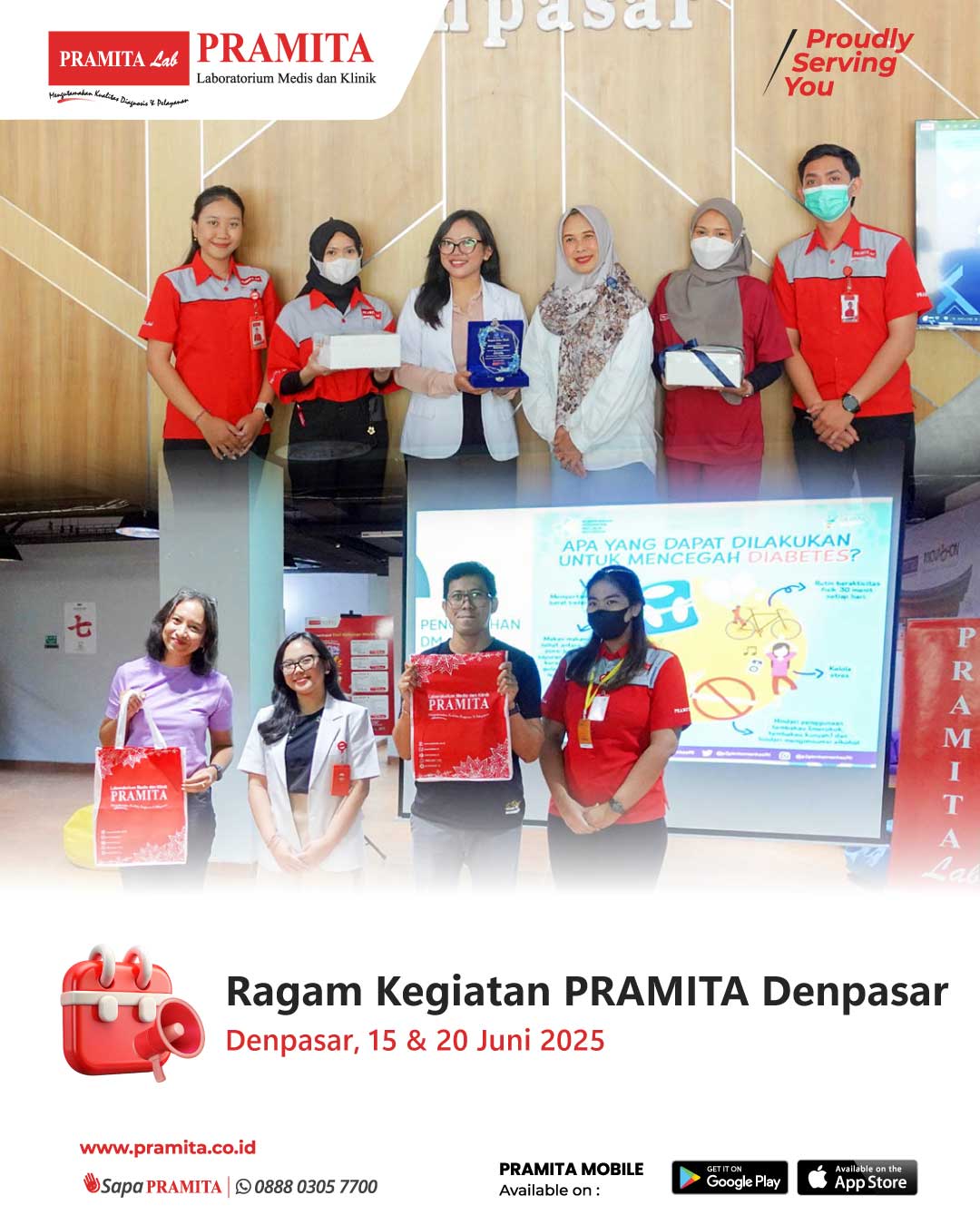 - Tanggal 20 Juni 2025, PRAMITA Denpasar berkontribusi dalam kegiatan Employee Happy Hour di Kantor PT. Mitrais Bali. Dalam kegiatan tersebut, tim PRAMITA membawakan edukasi kesehatan bertema Penyakit Metabolik Sindrom “Diabetes Melitus” serta membuka layanan skrining pemeriksaan sederhana untuk para pegawai yang hadir.