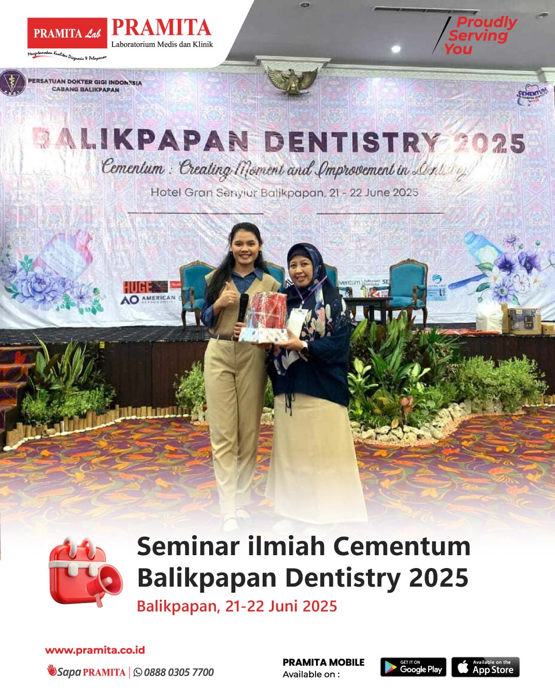 Pada tanggal 20–21 Juni 2025, PRAMITA Cabang Balikpapan turut berperan aktif dalam suksesnya Seminar Ilmiah Cementum Balikpapan Dentistry 2025 yang diselenggarakan oleh PDGI (Persatuan Dokter Gigi Indonesia) Cabang Balikpapan, bertempat di Gran Senyiur Hotel & Resort Balikpapan. Mengusung tema “Cementum: Creating Moment and Improvement in Dentistry”, seminar dihadiri lebih dari 300 peserta, terdiri dari dokter gigi umum dan spesialis se-Kalimantan Timur.