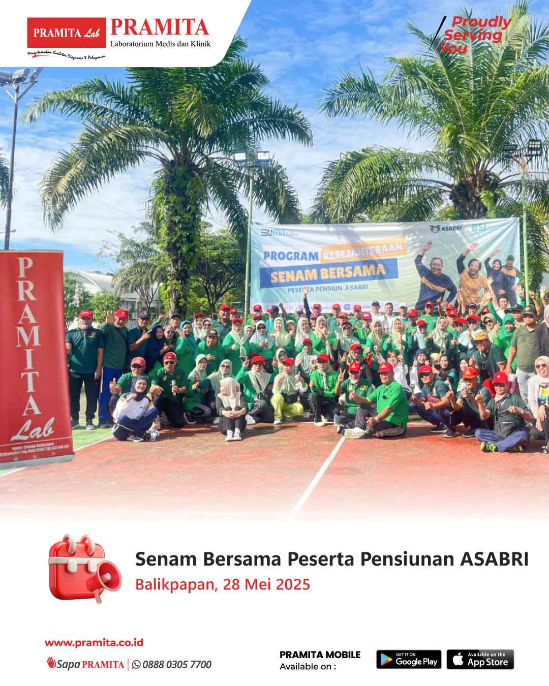 Sat, 7 Jun 2025Pada tanggal 28 Mei 2025, PRAMITA Cabang Balikpapan turut berpartisipasi dalam kegiatan Senam Bersama yang diselenggarakan oleh Bank BSI Balikpapan dan ASABRI. Acara ini berlangsung di Lapangan Tenis Indoor, Balikpapan Tennis Stadium, dan diikuti oleh lebih dari 200 peserta yang terdiri dari nasabah, rekanan Bank BSI, serta pensiunan peserta ASABRI. Sebagai bentuk dukungan terhadap peningkatan kualitas kesehatan, PRAMITA membuka booth layanan pemeriksaan untuk screening diabetes melitus dan hipertensi. Selain itu, PRAMITA juga memperkenalkan layanan pemeriksaan khusus dalam rangka menyambut Hari Keluarga Nasional 2025.