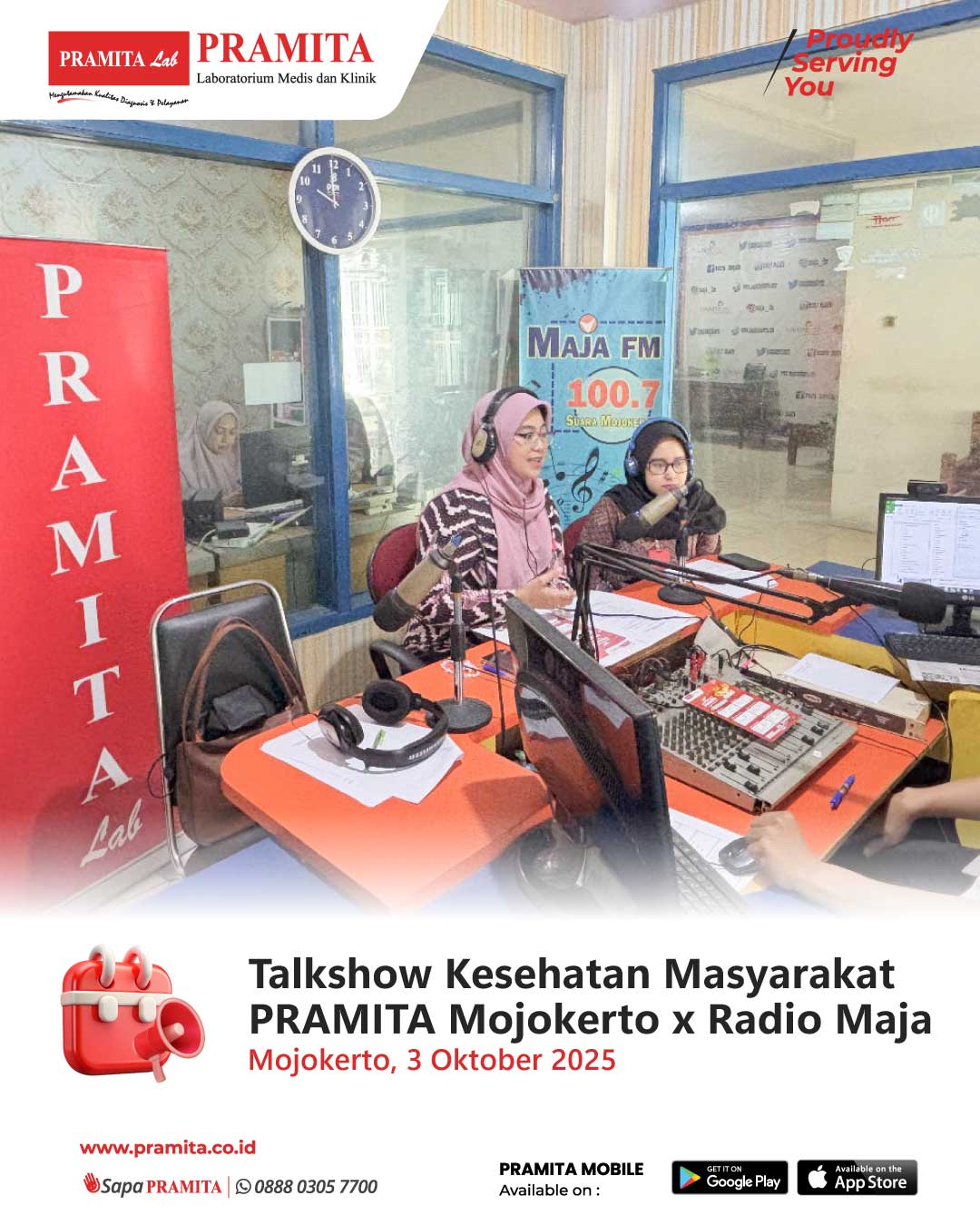 Fri, 10 Oct 2025Pada tanggal 3 Oktober 2025, PRAMITA Cabang Mojokerto kembali membangun brand awareness dengan memberikan edukasi kesehatan masyarakat melalui Talkshow Radio Maja FM 100,7 Suara Mojokerto yang mengangkat tema “Gangguan Kesehatan Metabolisme: Hipertensi dan Diabetes.” Dalam acara tersebut, hadir dr. Etty Herlin Indriati, Dokter Pelayanan Medis PRAMITA Cabang Mojokerto, bersama Ibu Dini Wulandari, Wakil Kepala Cabang PRAMITA Mojokerto, sebagai narasumber. Keduanya membahas berbagai faktor risiko...
