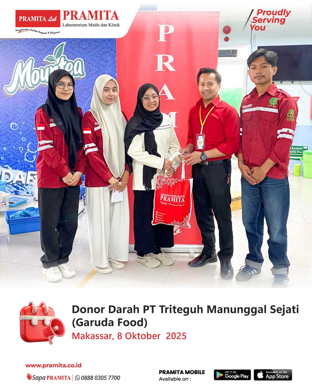 Fri, 17 Oct 2025Tanggal 8 Oktober 2025, PRAMITA Cabang Makassar turut berpartisipasi dalam program CSR yang digagas oleh PT Triteguh Manunggal Sejati (Garuda Food) Kota Makassar. Dalam kegiatan ini, PRAMITA Makassar memberikan layanan pemeriksaan kesehatan gratis berupa cek gula darah dan hipertensi, serta membagikan voucher pemeriksaan bagi para pendonor darah, sekaligus memberikan edukasi tentang pentingnya pemeriksaan kesehatan secara berkala. Melalui kegiatan ini, PRAMITA Makassar berharap dapat mempe...