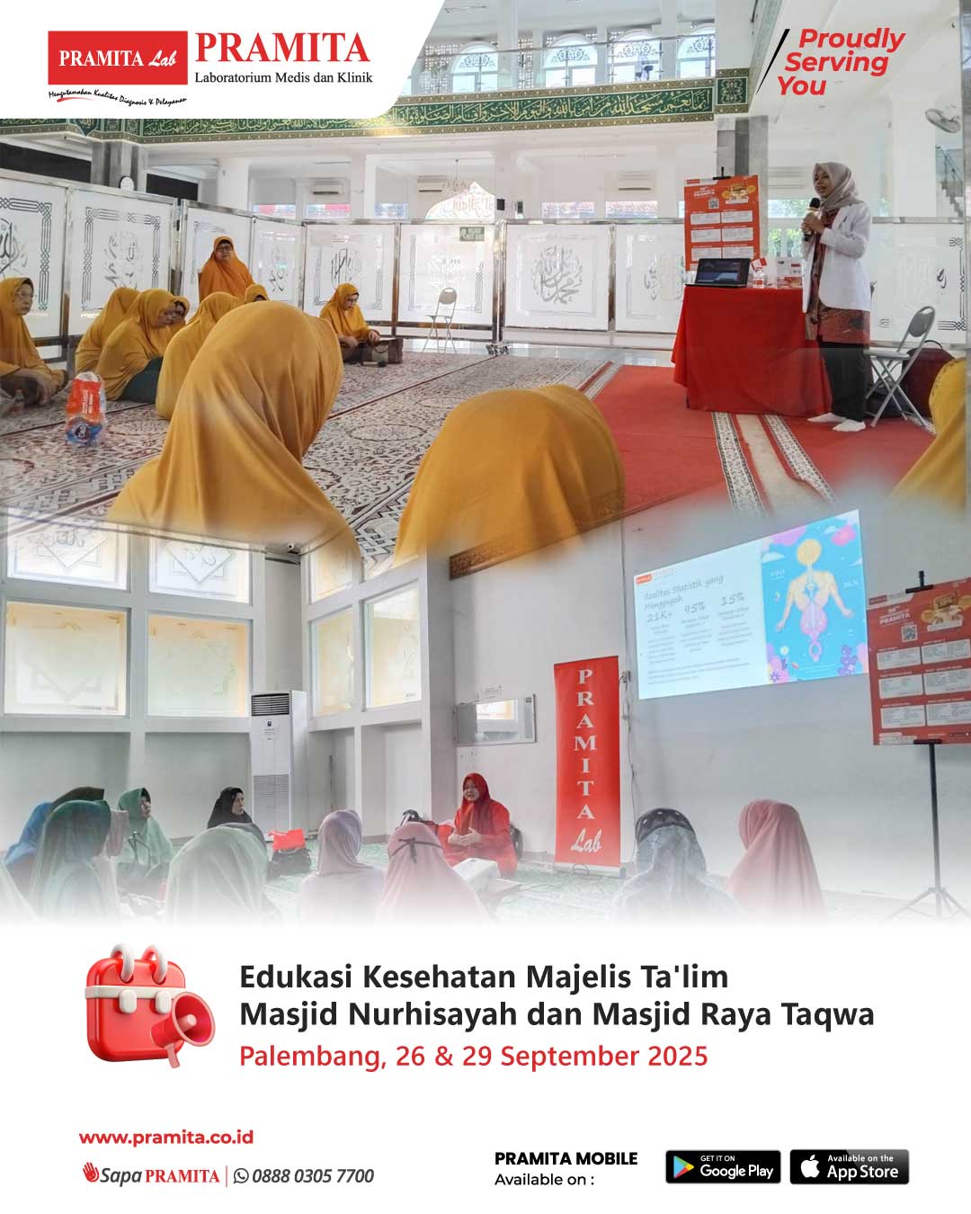 Fri, 3 Oct 2025Di penghujung bulan September 2025, PRAMITA Palembang membangun brand awareness di komunitas keagamaan Kota Palembang. Tanggal 26 September 2025, PRAMITA Palembang mengisi edukasi kesehatan bertajuk "Pentingnya Deteksi Dini untuk Langkah Awal Pencegahan Penyakit" dengan narasumber dr. Syarifa Aisyah kepada 50 jamaah Majelis Ta’lim yang hadir di Masjid Nurhidayah Palembang. Berlanjut pada 29 September 2025, PRAMITA Palembang memberikan edukasi kesehatan kepada jamaah Majelis Ta’lim Masjid Raya Ta...