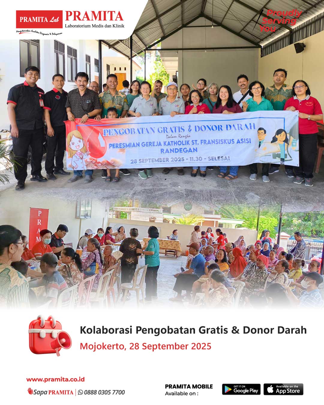 Fri, 3 Oct 2025PRAMITA Cabang Mojokerto pada tanggal 28 September 2025, turut ambil bagian pada kegiatan bakti sosial : Pengobatan Gratis dan Donor Darah kolaborasi bersama tim Kesehatan Gereja Katolik Mojokerto dan PMI Kota Mojokerto dalam rangka peresmian Gereja Katolik St. Fransiskus Asisi, Randegan, Kabupaten Mojokerto. Rangkaian bakti sosial meliputi : layanan pemeriksaan kesehatan skrining glukosa darah acak, asam urat, kolesterol, hipertensi, pemeriksaan dokter, pemberian obat gratis, hingga donor darah...
