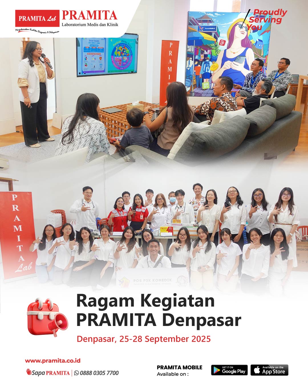Sat, 4 Oct 2025Pada tanggal 25 September 2025, PRAMITA berkolaborasi dengan Bank Permata Denpasar mengadakan edukasi kesehatan bertema “Risiko Diabetes Melitus” kepada nasabah prioritas Bank Permata Denpasar. Pada kesempatan tersebut, peserta juga mendapatkan pemeriksaan Body Composition Analysis (BCA). Melalui kegiatan ini, peserta diajak memahami risiko diabetes sekaligus pentingnya menjaga gaya hidup sehat. Selanjutnya, pada tanggal 28 September 2025, PRAMITA Denpasar bekerja sama dengan Gereja Katolik...