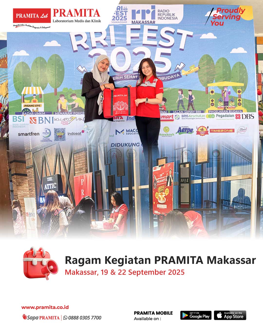 Sat, 27 Sep 2025PRAMITA Cabang Makassar membuktikan konsistensinya dalam mendukung gaya hidup sehat masyarakat melalui partisipasi aktif di berbagai agenda komunitas dan institusi. - 19 September 2025 – PRAMITA Makassar turut serta dalam RRI Makassar Fest 2025 yang digelar dalam rangka anniversary Radio Republik Indonesia di halaman dan aula RRI Makassar. Acara ini menghadirkan beragam kegiatan mulai dari pagelaran budaya, penanaman pohon, bazar UMKM, donor darah, hingga jalan sehat. Dalam kesempatan ini, PR...