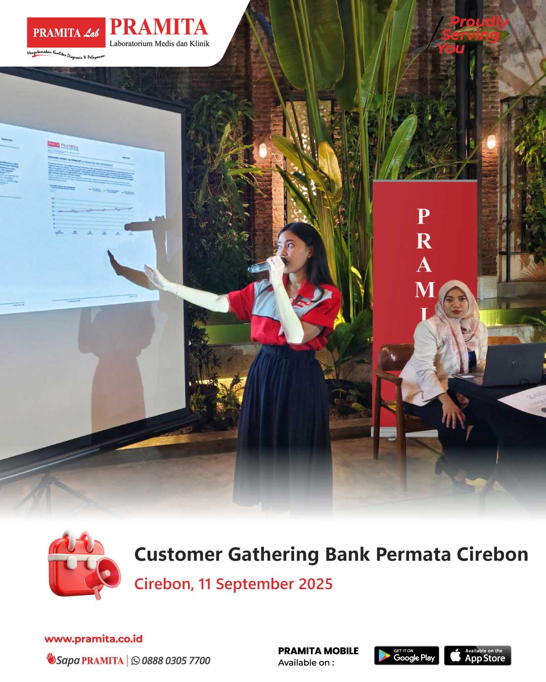 Fri, 19 Sep 2025Tanggal 11 September 2025, PRAMITA Cirebon turut berkontribusi menyukseskan Customer Gathering Nasabah Prioritas Permata Bank Cirebon. Kegiatan yang digagas oleh Bank Permata Cirebon ini menjadi ajang silaturahmi sekaligus bentuk apresiasi kepada nasabah prioritas, dengan menggandeng PRAMITA Lab sebagai mitra penyedia layanan kesehatan. Dalam acara tersebut, PRAMITA Cabang Cirebon membuka booth informasi layanan laboratorium, menyediakan pemeriksaan tekanan darah, screening glukosa darah, s...