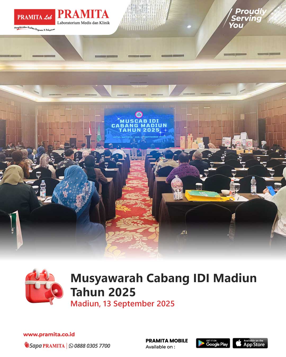 Fri, 19 Sep 2025Pada tanggal 13 September 2025, PRAMITA Madiun berpartisipasi dalam Musyawarah Cabang (MUSCAB) Ikatan Dokter Indonesia (IDI) Cabang Madiun 2025 yang diselenggarakan di Ballroom Bima, Hotel Aston Madiun. Acara ini menjadi forum penting bagi para dokter untuk bermusyawarah sekaligus memperbarui pengetahuan medis, dengan PRAMITA hadir sebagai mitra penyedia layanan pemeriksaan penunjang diagnostik. Pada MUSCAB IDI 2025 juga dipaparkan materi “Pemeriksaan Hepatitis B menurut WHO” oleh narasumber...
