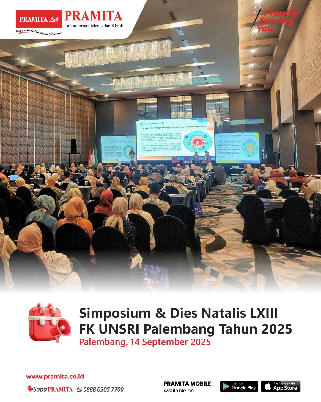 Fri, 19 Sep 2025Tanggal 14 September 2025, PRAMITA Cabang Palembang turut berperan aktif sebagai pengelola self register peserta dalam Simposium & Dies Natalis LXIII Fakultas Kedokteran Universitas Sriwijaya (FK UNSRI) Palembang yang bertempat di Ballroom Hotel Harper Palembang. Mengusung tema “Nurture from the Beginning”, Dies Natalis tahun 2025 ini menekankan pentingnya peran FK UNSRI dalam menyiapkan generasi unggul yang adaptif, kolaboratif, dan inspiratif. Kegiatan simposium menjadi wadah untuk memperku...