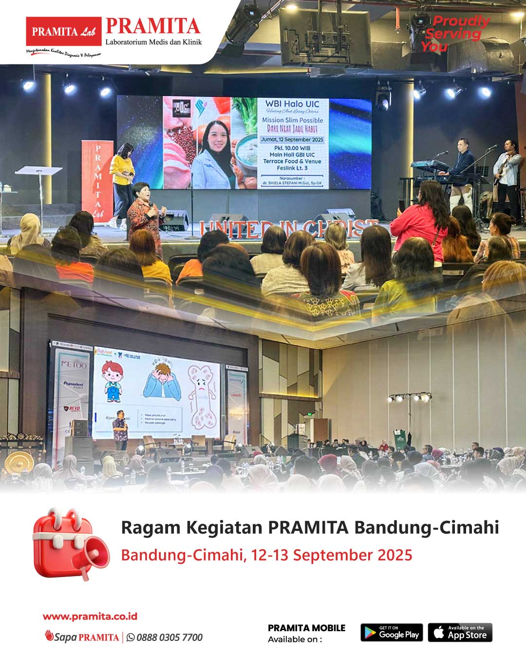 Fri, 19 Sep 2025PRAMITA Bandung–Cimahi terus aktif mendukung kegiatan promotif dan preventif kesehatan melalui partisipasi dalam berbagai acara komunitas maupun akademis. Tanggal 12 September 2025, PRAMITA Bandung–Cimahi mendapat kepercayaan untuk memberikan edukasi kesehatan bertajuk “Mission Slim Possible: Dari Niat Jadi Habbit!” bagi Jemaat WBI UIC Festival Citylink. Dibawakan oleh dr. Shiela Stefani, M.Gizi., Sp.GK., AIFO-K, FINEM, sesi ini menekankan pentingnya konsumsi buah dan sayur dalam pola diet se...