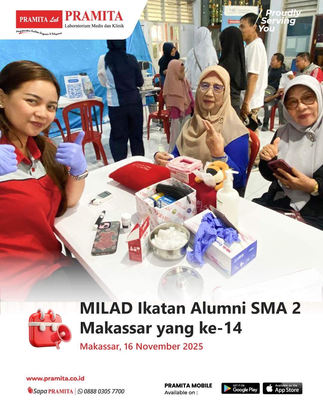 Sat, 22 Nov 2025Tanggal 16 November 2025, PRAMITA Cabang Makassar turut berpartisipasi dalam peringatan MILAD Ikatan Alumni SMA 2 Makassar (SMADA) ke-14 yang dihadiri sekitar 200 peserta, termasuk alumni dan para guru SMADA. Acara berlangsung penuh kehangatan dan antusiasme sebagai wujud kebersamaan lintas generasi. Dalam kegiatan ini, PRAMITA Makassar membuka layanan pemeriksaan kesehatan gratis cek gula darah, sekaligus membagikan voucher pemeriksaan dan memberikan edukasi kesehatan tentang pentingnya pem...