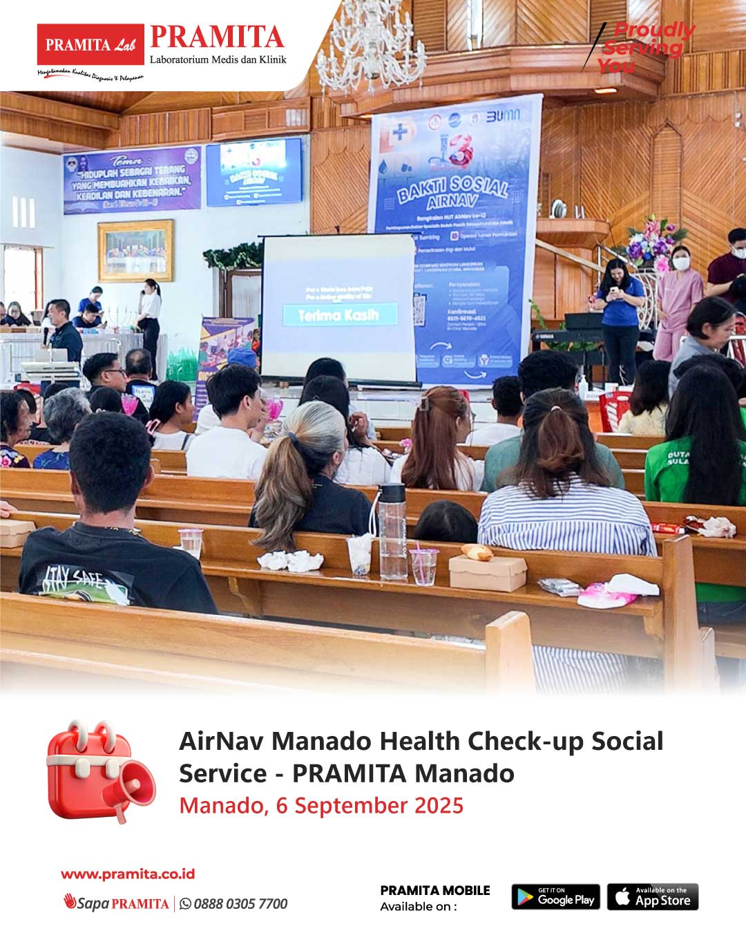 Sat, 13 Sep 2025Pada hari Sabtu, 6 September 2025, PRAMITA Manado turut berkontribusi dalam kegiatan Bakti Sosial Pemeriksaan Kesehatan Gratis yang digagas oleh AirNav Manado sebagai rangkaian HUT ke-13 di Gereja GMIM Schwarz Sentrum Langowan, Minahasa. Kegiatan diikuti lebih dari 100 peserta, terdiri dari masyarakat umum dan jemaat gereja. Dalam kesempatan tersebut, PRAMITA Manado membuka meja layanan pemeriksaan mini MCU mencakup skrining gula darah sewaktu, pengukuran tekanan darah, dan BMI, serta membagi...