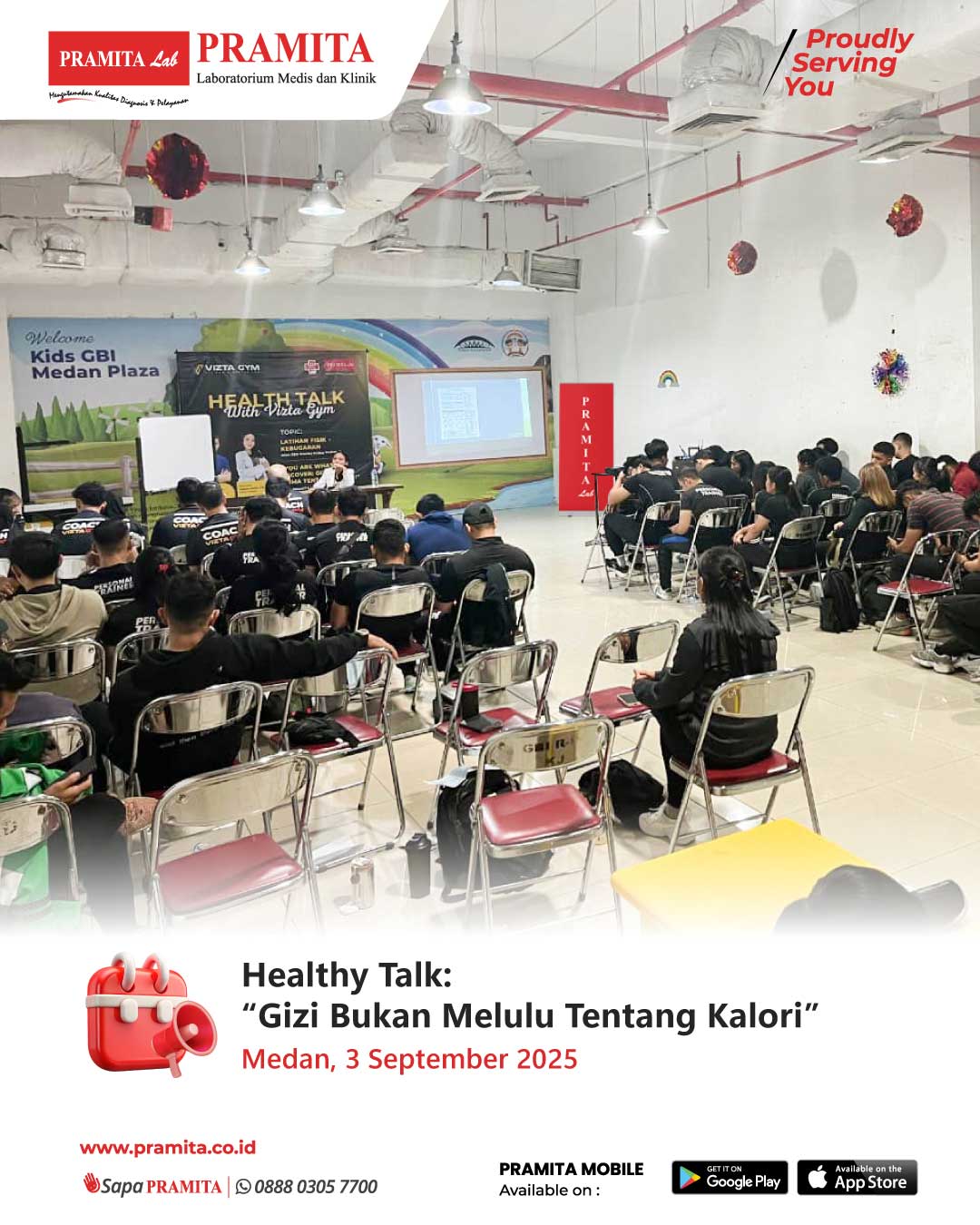 Sat, 13 Sep 2025Rabu, 3 September 2025, PRAMITA Medan berpartisipasi dalam acara Healthy Talk bertajuk “Gizi Bukan Melulu Tentang Kalori” yang digagas oleh Vizta Gym Medan. Hadir lebih dari 80 peserta, terdiri dari personal trainer dan member Vizta Gym, yang menyimak dengan saksama materi tentang pentingnya pemenuhan gizi seimbang yang tidak hanya berfokus pada kalori, tetapi juga kualitas nutrisi bagi tubuh. Materi ini dibawakan oleh Ahli Gizi/Nutritionist PRAMITA Medan. Pada kesempatan tersebut, PRAMITA juga...