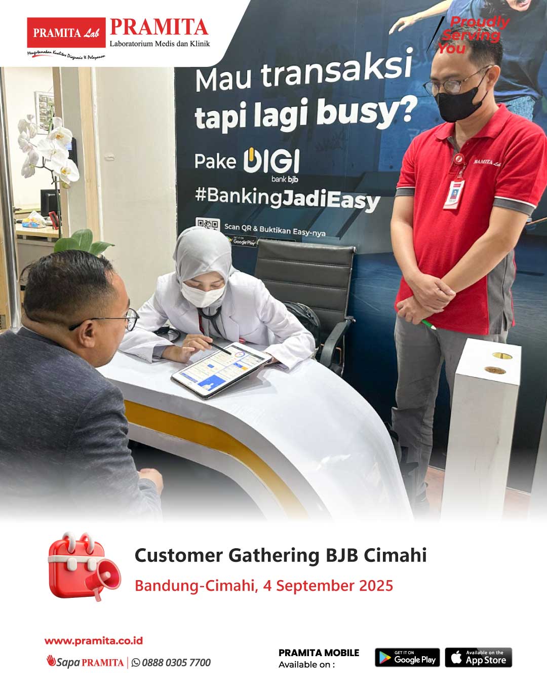 Thu, 18 Sep 2025Kamis, 4 September 2024, dalam rangka Hari Pelanggan Nasional 2025, PRAMITA Bandung-Cimahi bersinergi dengan Bank BJB Cabang Cimahi menghadirkan layanan “Medical Check Up Mini bagi Nasabah Bank BJB Cimahi”. Nasabah prioritas maupun umum tampak antusias memanfaatkan rangkaian pemeriksaan kesehatan yang disediakan. Pada kesempatan tersebut, PRAMITA menghadirkan layanan pemeriksaan gratis, di antaranya pemeriksaan kolesterol, asam urat, gula darah sewaktu, Body Composition Analysis (BCA), sert...