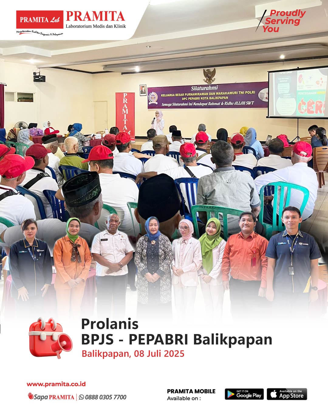 Mon, 21 Jul 2025Sosialisasi Kesehatan Program Prolanis BPJS bagi Purnawirawan PEPABRI Balikpapan Pada tanggal 8 Juli 2025, PRAMITA Cabang Balikpapan memberikan sosialisasi Program Prolanis BPJS Kesehatan pada pertemuan rutin Purnawirawan Angkatan Bersenjata Republik Indonesia (PEPABRI) Balikpapan yang bertempat di aula Kantor PEPABRI Balikpapan. Lebih dari 100 anggota hadir dan mengikuti rangkaian acara dengan penuh antusias. Dalam pertemuan tersebut, PRAMITA Balikpapan menyampaikan sosialisasi Program BP...