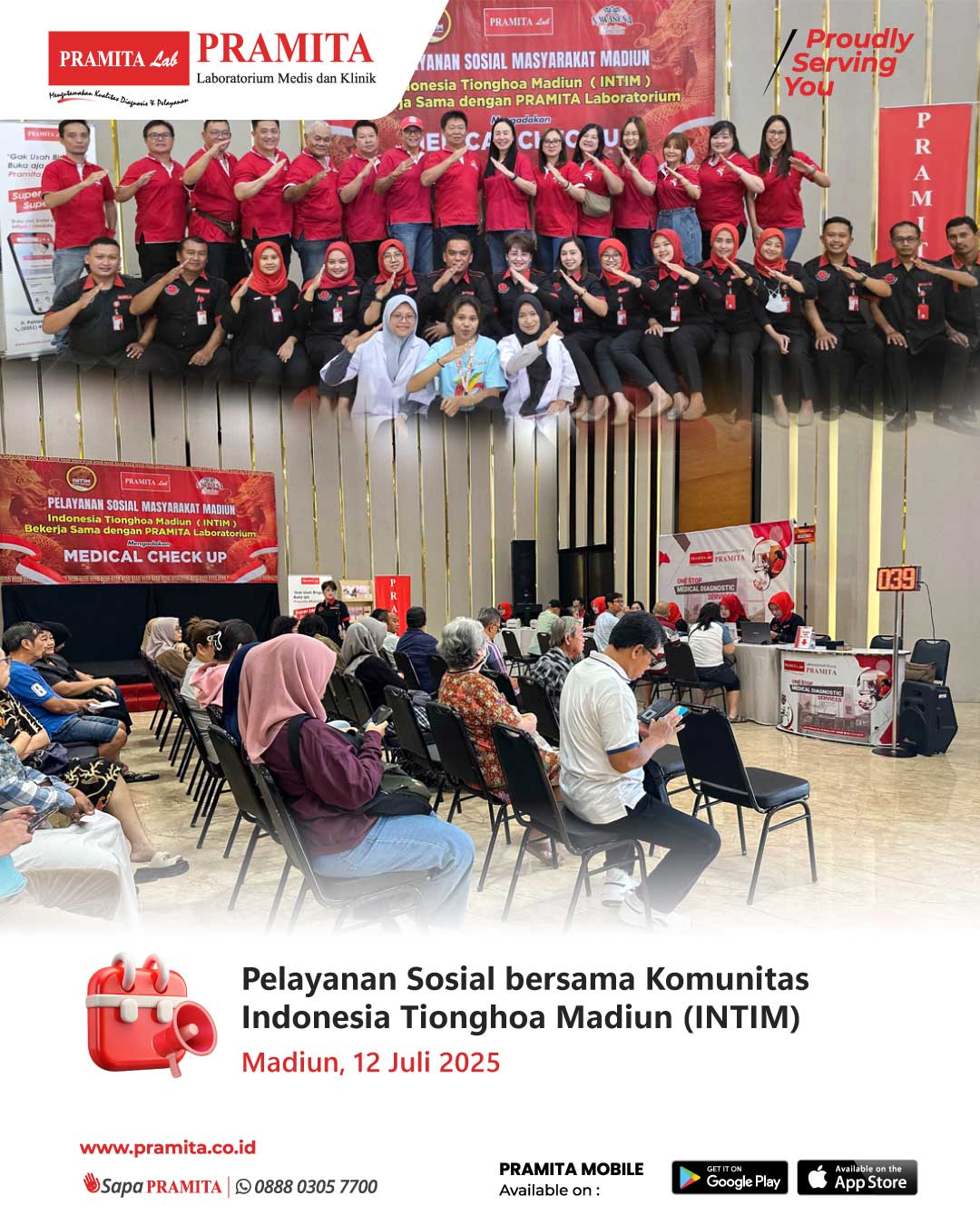 Fri, 25 Jul 2025Pada tanggal 12 Juli 2025, PRAMITA Cabang Madiun berkolaborasi dengan Komunitas Indonesia Tionghoa Madiun (INTIM) mengadakan kegiatan Pelayanan Sosial yang bertempat di Nawasena Madiun. Kegiatan ini dihadiri oleh sekitar 300 peserta dari komunitas INTIM dan masyarakat umum. Dalam kesempatan ini, PRAMITA memberikan diskon spesial untuk beberapa paket pemeriksaan serta diskon 25% untuk pemeriksaan rutin lainnya. Tampak antusiasme peserta, karena lebih dari 260 orang memanfaatkan kesempatan te...