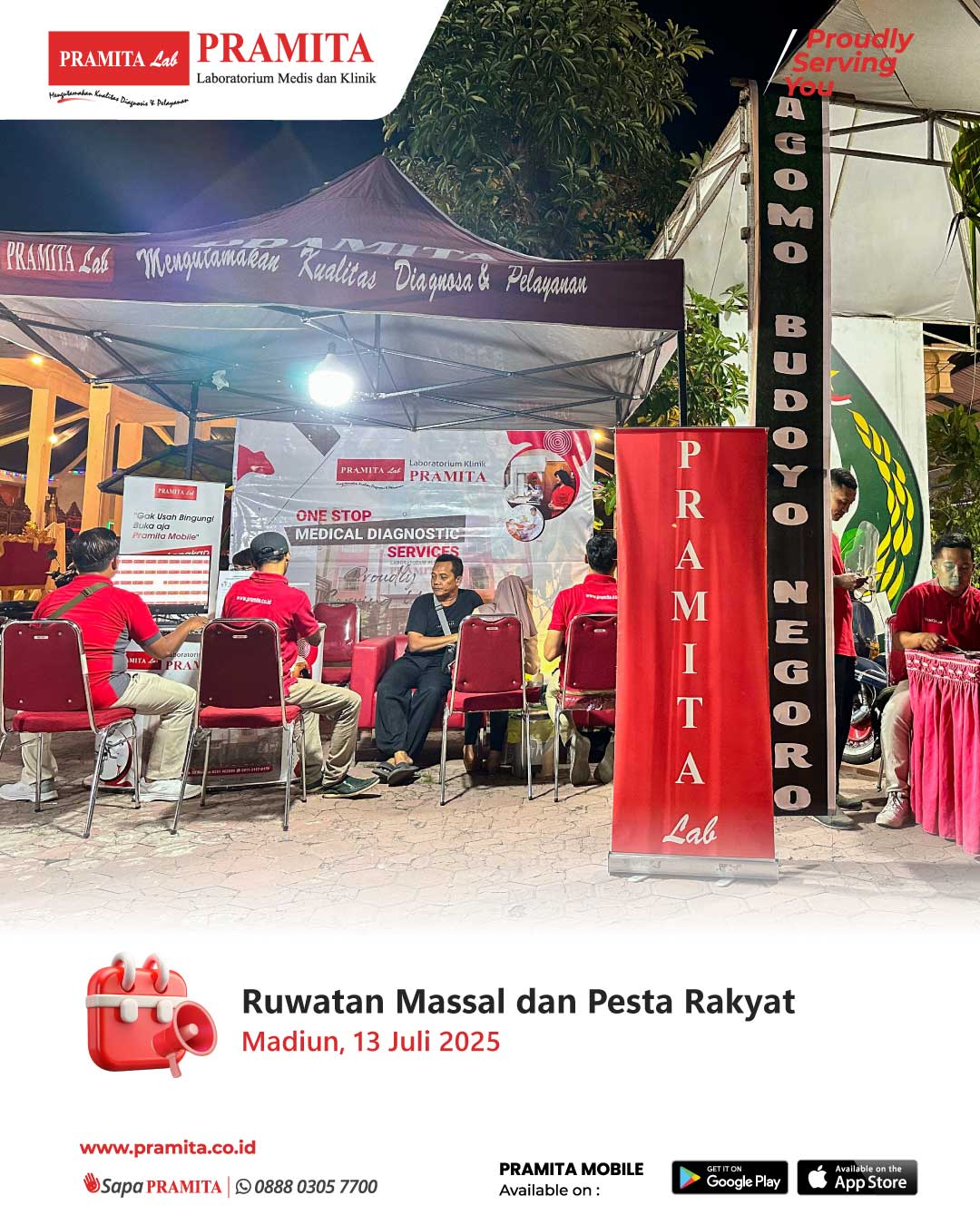 Sat, 26 Jul 2025Minggu, 13 Juli 2025 – PRAMITA Cabang Madiun turut berkontribusi dalam kegiatan Ruwatan Massal & Pesta Rakyat yang diadakan oleh komunitas Padepokan Seni Kirun, bertempat di Padepokan Seni Kirun, Madiun. Acara ini dihadiri oleh lebih dari 300 orang dari berbagai kalangan, di antaranya pejabat daerah, pelaku seni, dan masyarakat umum Kota Madiun. Pada acara tersebut, PRAMITA membuka tenda booth layanan pemeriksaan skrining gratis gula darah, pengukuran tekanan darah, serta memberikan voucher peme...