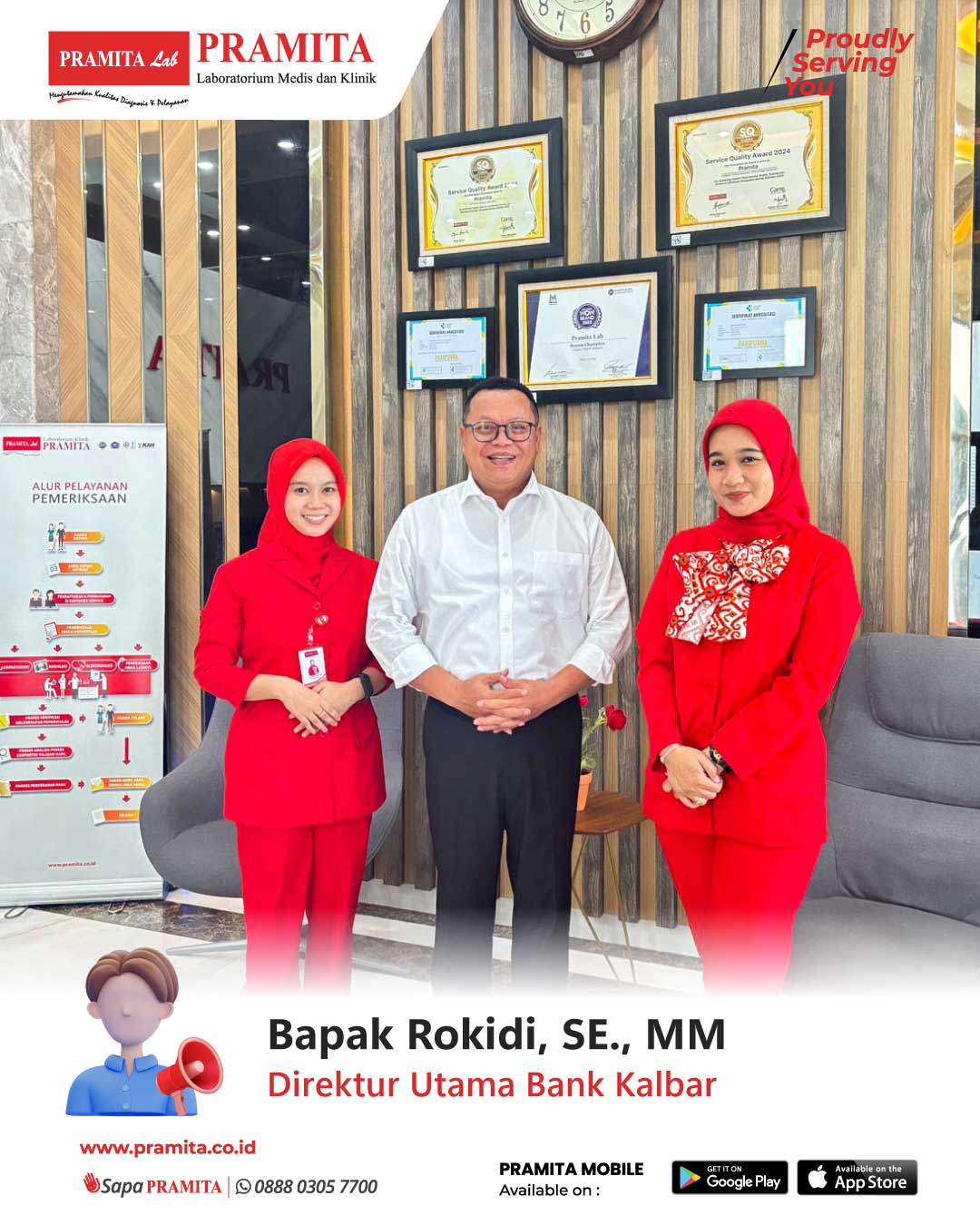 Thu, 3 Jul 2025Terimakasih kepada Bapak Rokidi, SE., MM (Direktur Utama Bank Kalbar) telah mempercayakan pemeriksaan kesehatan / Medical Check Up di Lab. Medis dan Klinik PRAMITA Cabang Pontianak Kalimantan Barat. Salam Sehat dan Sukses Selalu.