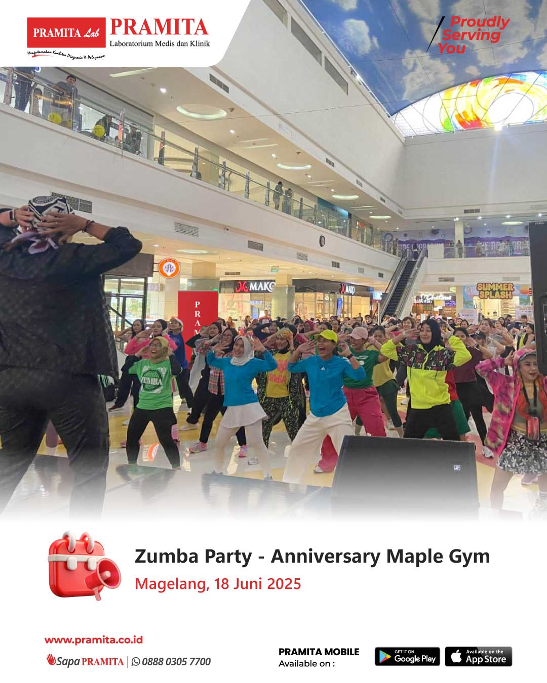 Sat, 28 Jun 2025Pada tanggal 18 Juni 2025, PRAMITA Cabang Magelang bersama komunitas Zumba turut mensukseskan Zumba Party dalam rangka Anniversary Maple Gym yang diadakan di Artos Mall Magelang. Lebih dari 70 orang member Maple Gym berbaur dengan masyarakat umum meramaikan acara. Sebagai bentuk dukungan terhadap gaya hidup sehat, PRAMITA Magelang menghadirkan layanan skrining kesehatan gratis, meliputi pemeriksaan gula darah (skrining diabetes), tekanan darah (skrining hipertensi), serta edukasi pentingnya menj...