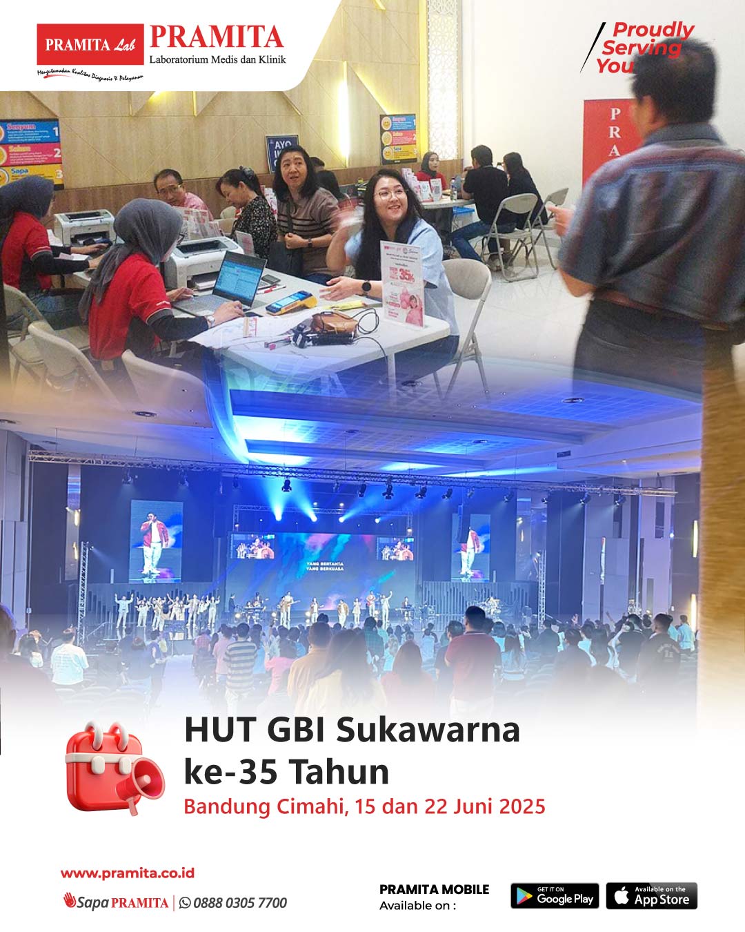 Sat, 28 Jun 2025Pada tanggal 15 dan 22 Juni 2025, dalam rangkaian HUT 35-Th,. GBI SUkawarna Bandung, bersinergi bersama PRAMA Cabang Bandung Cimahi selenggarakan kegiatan Sehat Rohani dan Sehat Jasmani dengan membuka layanan registrasi harga spesial all item pemeriksaan bagi Jemaat GBI SUkawarna Bandung. Registrasi dilakukan di lobby gereja pasca jemaat melakukan ibadah di- beberapa cabang GBI Sukawarna Bandung. Antusiasme jemaat terlihat dari banyaknya jemaat memanfaatkan layanan ini. PRAMITA t...