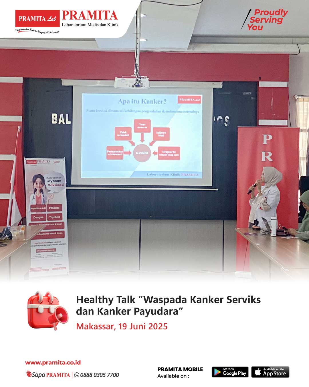 Sat, 28 Jun 2025Tanggal 19 Juni 2025, PRAMITA Cabang Makassar memperkuat branding perusahaan dengan berkontribusi dalam Pertemuan Rutin Dharma Wanita Persatuan (DWP) Balai Besar Veteriner (BBVET) Maros yang dihadiri oleh Drh. Angelina Susanty Butarbutar (Ketua Dharma Wanita BBVET Maros) dan puluhan anggota aktif BBVET. Dalam pertemuan tersebut, PRAMITA Makassar mendapat kesempatan mengisi Healthy Talk bertema “Waspada Kanker Serviks & Kanker Payudara”, serta memberikan layanan pemeriksaan gratis berupa gluko...