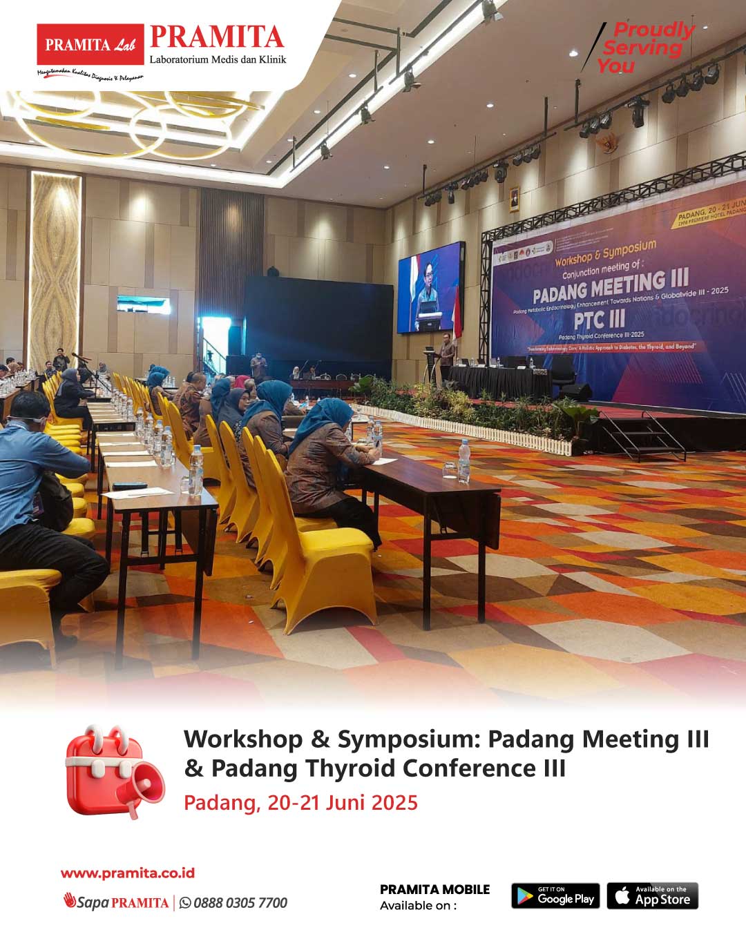 Tue, 1 Jul 2025PRAMITA Cabang Padang berpartisipasi aktif dalam kegiatan ilmiah Padang Meeting III & Padang Thyroid Conference yang diselenggarakan oleh Divisi Endokrin Metabolik Departemen Ilmu Penyakit Dalam FK UNAND/RSUP Dr. M. Djamil Padang. Acara berlangsung selama dua hari, 20–21 Juni 2025, di ZHM Hotel Padang, dan dihadiri oleh sekitar 150 peserta yang terdiri dari dokter umum, residen, serta dokter spesialis dari berbagai institusi. Sebagai bentuk dukungan terhadap pengembangan ilmu kedokteran dan peni...