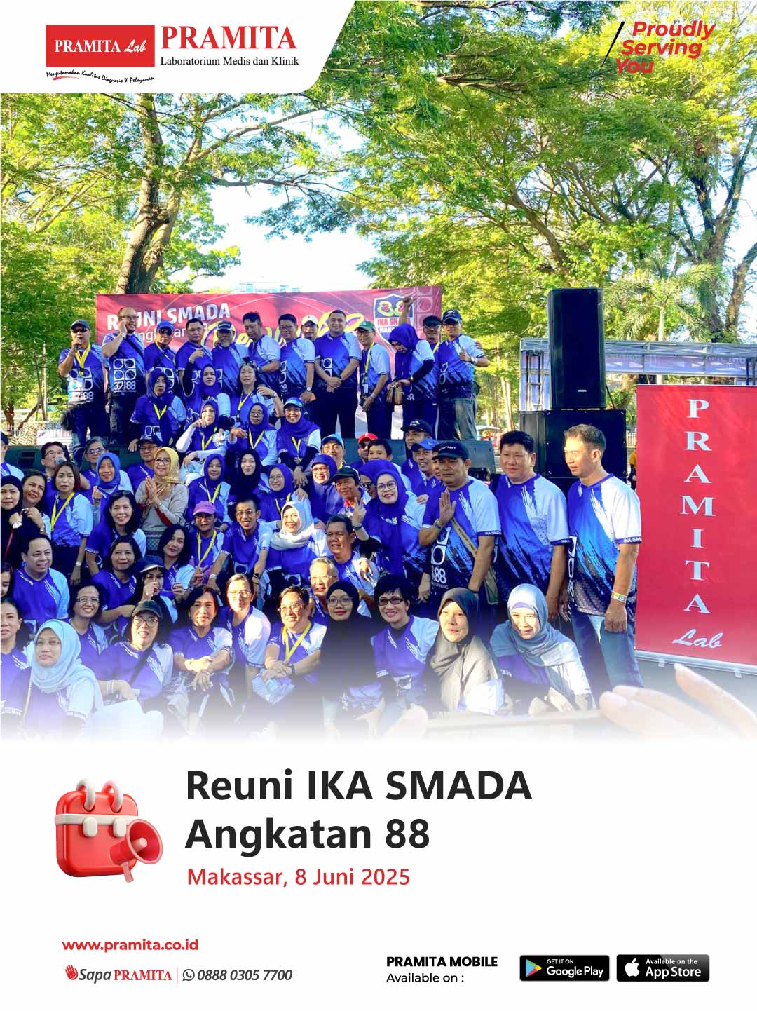 Sat, 14 Jun 2025Reuni IKA SMADA Angkatan 88 Pada tanggal 08 Juni 2025 — PRAMITA Cabang Makassar membangun branding perusahaan dalam kegiatan Reuni IKA SMADA Angkatan 88 yang diselenggarakan oleh Ikatan Alumni SMA Negeri 2 Makassar. Lebih dari 300 orang alumni secara antusias hadir pada Reuni 37 Th. IKA SMADA Makassar yang dibuka oleh Wali Kota Makassar, Bapak Munafri Arifuddin, serta Komjen Pol. Dr. H. Moh. Fadil Imran (Kabaharkam POLRI) selaku Pelindung IKA SMADA Makassar. Berbagai kegiatan meriah tur...