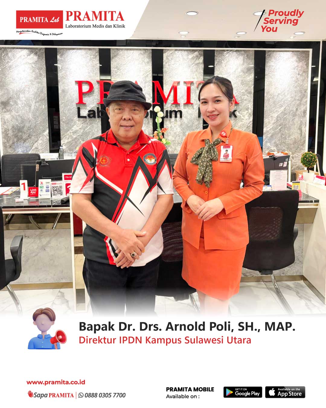 Thu, 19 Jun 2025Terima kasih kepada Bapak Dr. Drs. Arnold Poli, SH., MAP. - Direktur IPDN Kampus Sulawesi Utara atas kepercayaan yang diberikan telah melakukan pemeriksaan di Klinik PRAMITA Cabang Manado. Salam sehat dan sukses selalu