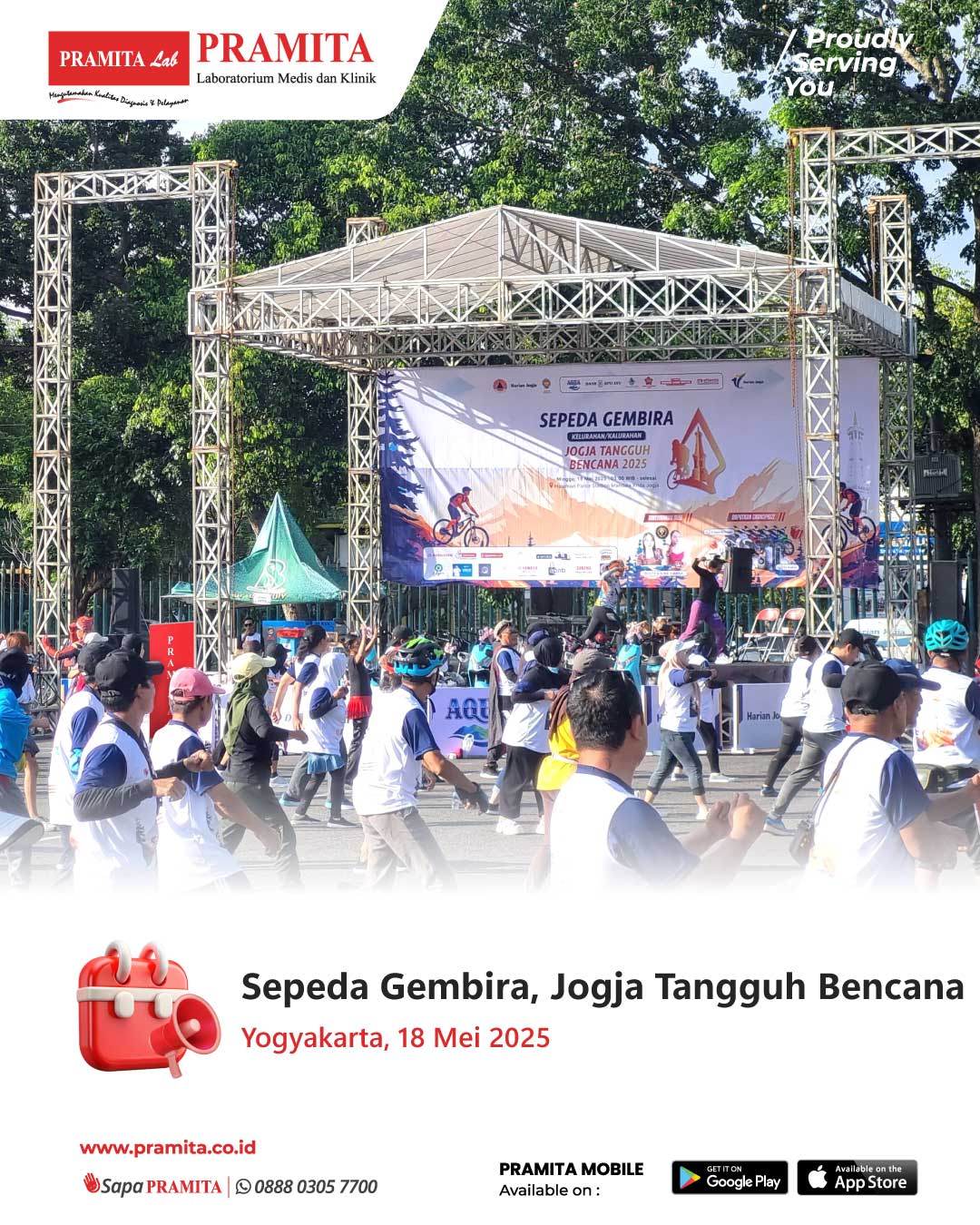 Sat, 24 May 2025Minggu, 18 Mei 2025, PRAMITA Cabang Yogyakarta membuka meja booth layanan kesehatan dalam kegiatan “Sepeda Gembira, Jogja Tangguh Bencana” yang digelar oleh BPBD DIY di Komplek Stadion Mandala Krida, Yogyakarta. Lebih dari 500 peserta dari komunitas sepeda dan masyarakat umum turut mendukung kampanye kesiapsiagaan bencana dengan semangat sehat dan aktif. Selain melayani free pemeriksaan kesehatan pada meja booth PRAMITA Yogyakarta, pengunjung juga mendapatkan voucher diskon medical check u...
