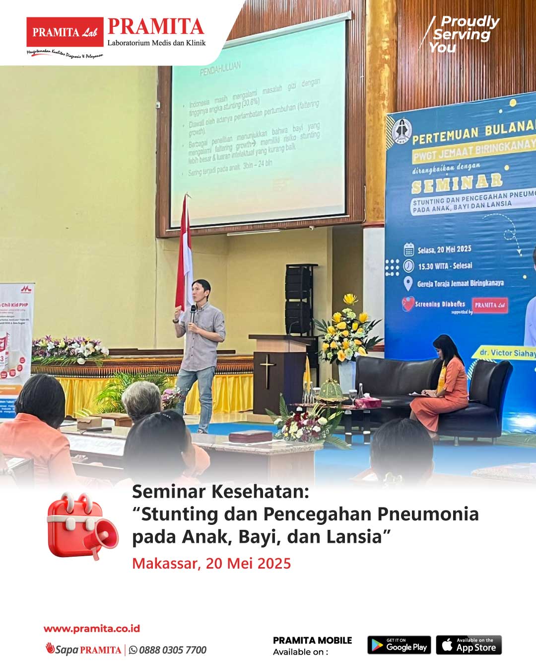Sat, 24 May 2025Pada tanggal 20 Mei 2025, PRAMITA Cabang Makassar berkesempatan berkontribusi dalam kegiatan seminar kesehatan bertajuk “Stunting dan Pencegahan Pneumonia pada Anak, Bayi, dan Lansia” yang diselenggarakan di Gereja Toraja Jemaat Biringkanaya dan dihadiri oleh lebih dari 100 orang jemaat Persekutuan Wanita Gereja Toraja (PWGT). Seminar ini menghadirkan narasumber dr. Victor S. Tjandra, Sp.A, yang menyampaikan pemaparan mengenai pentingnya pencegahan penyakit pada kelompok usia rentan. Dalam...