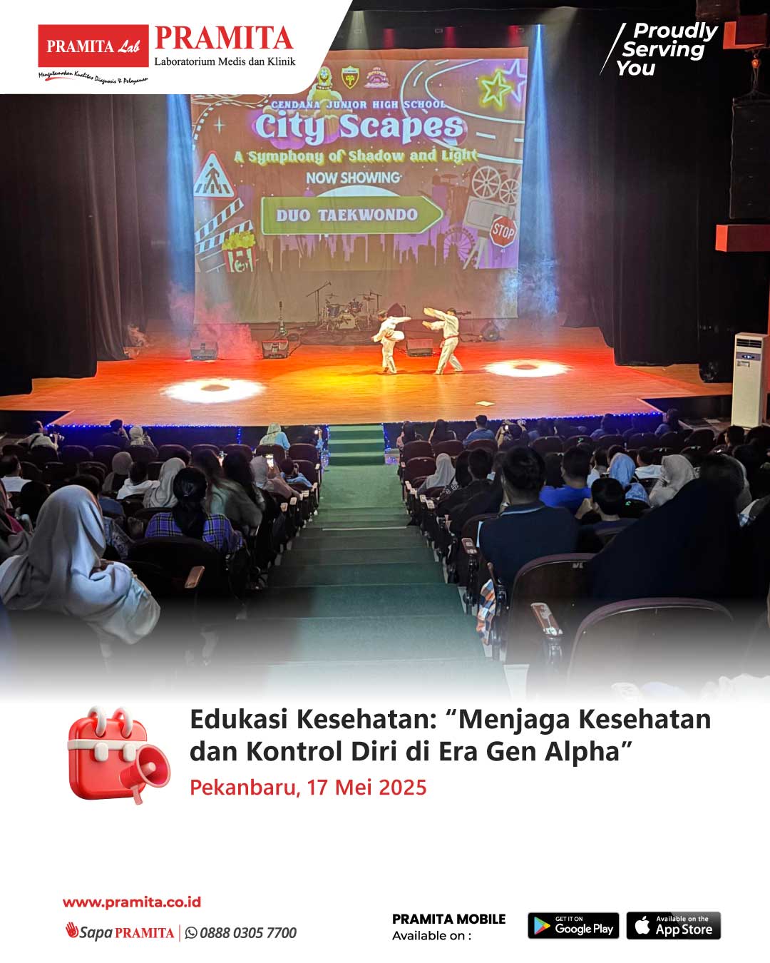 Sat, 31 May 2025Tanggal 17 Mei 2025, PRAMITA Cabang Pekanbaru turut berkontribusi dalam malam kesenian bertajuk “City Scapes: A Symphony of Shadow and Light” yang digagas oleh Yayasan SMP Cendana Pekanbaru. Salah satu rangkaian acara adalah edukasi kesehatan bertema “Menjaga Kesehatan dan Kontrol Diri di Era Gen Alpha” yang disampaikan oleh dr. Melynda Elka Putri. Edukasi ini diikuti oleh lebih dari 50 peserta yang terdiri dari guru serta siswa-siswi SMP Cendana Pekanbaru. Kegiatan ini bertujuan memberikan wawa...