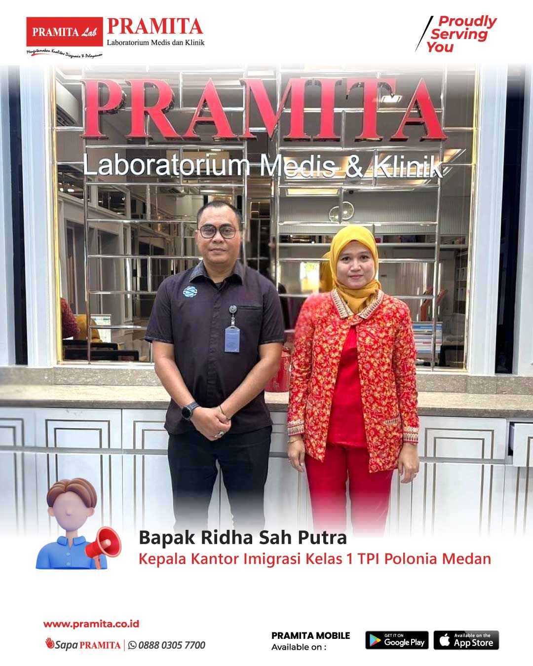 Mon, 3 Nov 2025Terimakasih kepada Bapak Ridha Sah Putra - Kepala Kantor Imigrasi Kelas 1 TPI Polonia Medan, telah mempercayakan pemeriksaan Medical Check Up di PRAMITA Cabang Diponegoro Medan. Salam sehat dan sukses selalu