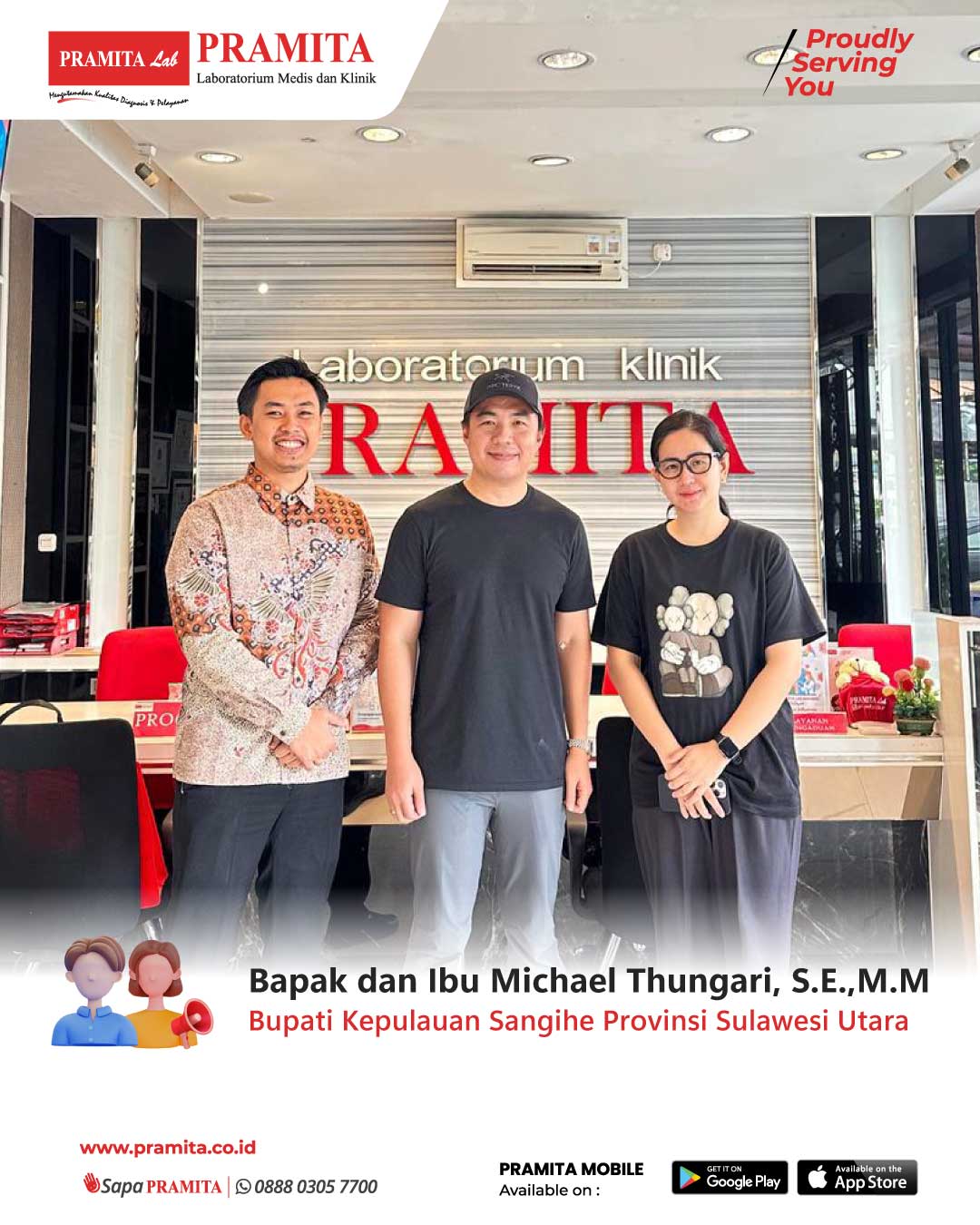 Wed, 5 Nov 2025Terimakasih kepada Bapak dan Ibu Michael Thungari, S.E.,M.M - Bupati Kepulauan Sangihe Provinsi Sulawesi Utara, telah mempercayakan pemeriksaan Medical Check Up di Laboratorium Medis dan Klinik PRAMITA Cabang Manado. Salam Sehat dan sukses selalu