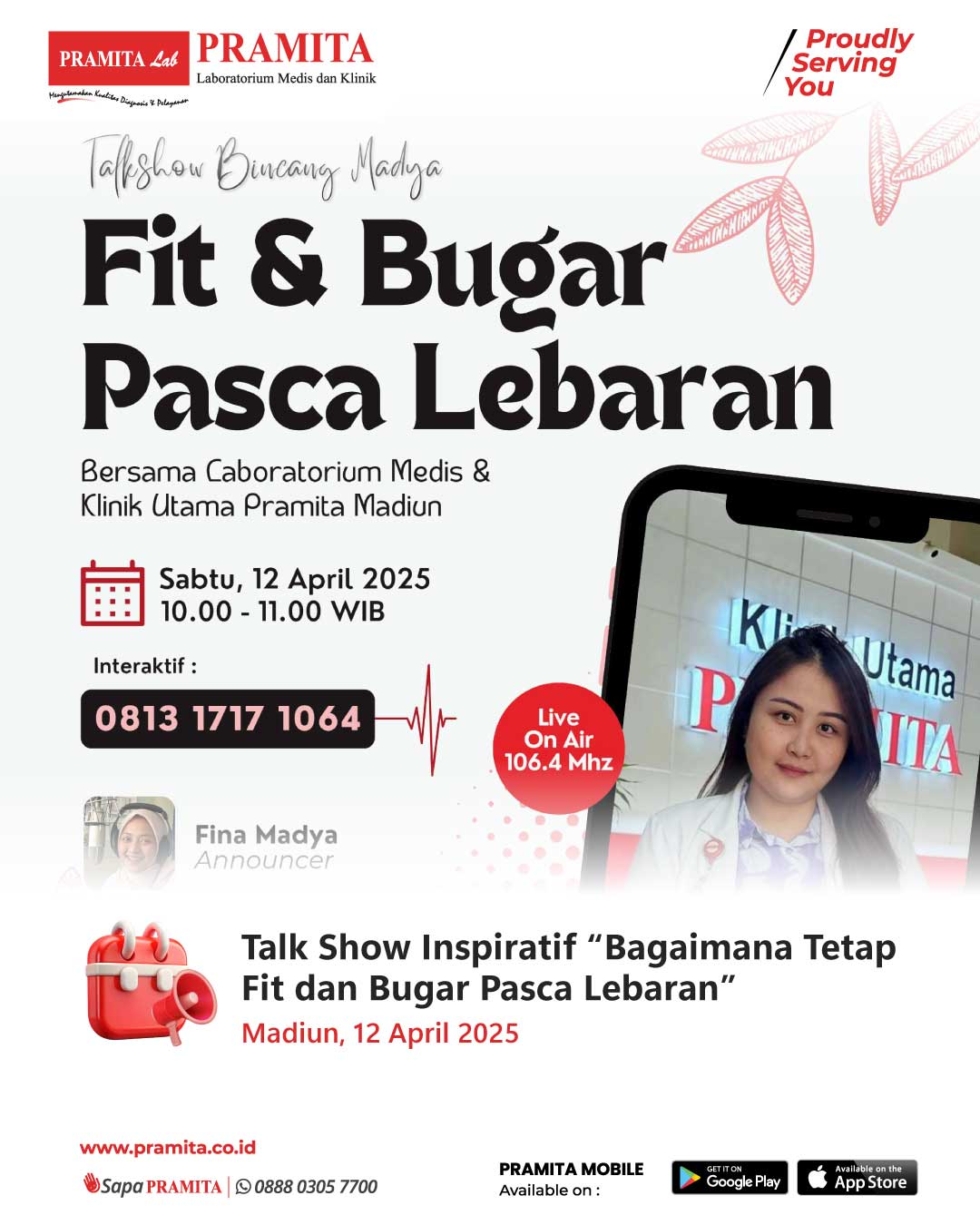 Sat, 29 Nov 2025Dalam rangka memperingati Hari Guru Nasional 2025, pada tanggal 21 November 2025 PRAMITA Cabang Surabaya turut memberikan dukungan pada kegiatan yang diselenggarakan di Aula SD Integral Luqman Al Hakim Surabaya. Acara ini dihadiri oleh sekitar 200 peserta, terdiri dari para guru, staf sekolah, serta wali murid yang berpartisipasi dengan antusias. Sebagai bentuk kepedulian terhadap kesehatan tenaga pendidik dan masyarakat, PRAMITA Surabaya membuka booth registrasi dan edukasi kesehatan, diser...